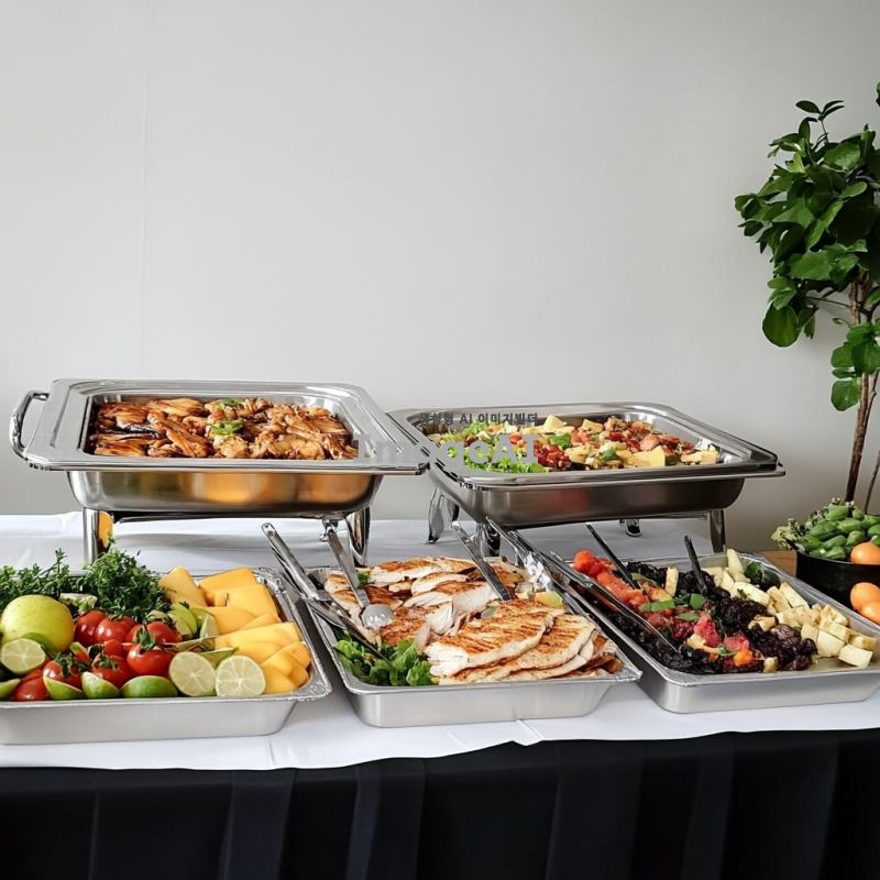 전문적인 사진으로, 정갈하게 배열된 플래터, 샐러드, 과일 테이블 세팅이 있는 사무실 미니 뷔페 테이블의 모습입니다. 주요 초점은 치킨 필레나 생선 같은 다양한 서양 요리로 가득 찬 두 개의 은색 체이핑 접시입니다. 배경은 연한 회색의 평범한 벽입니다.
