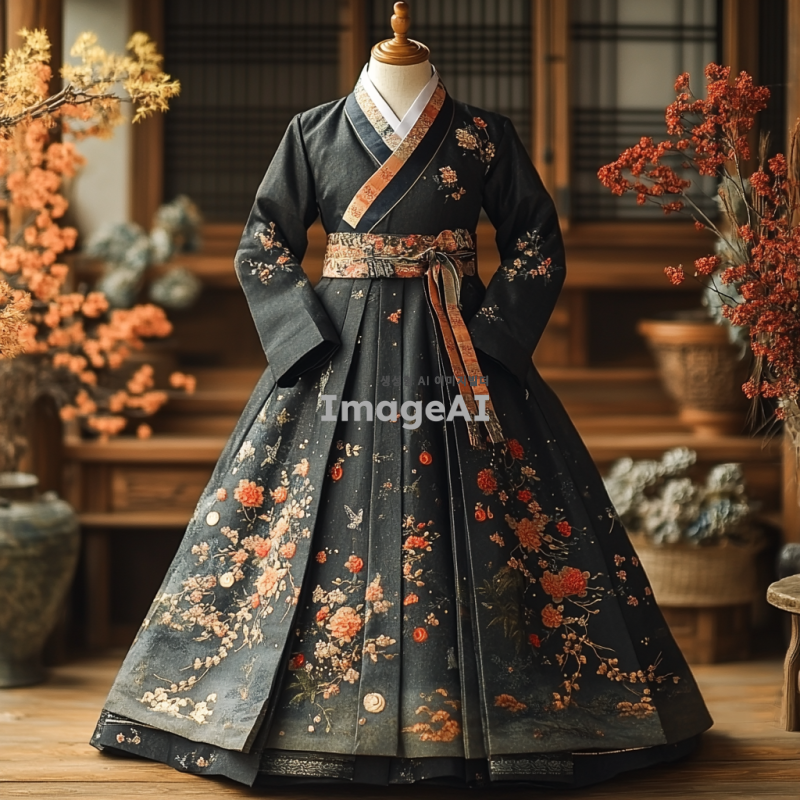 고급스러운 한복을 정장처럼 디자인한 모습, 세련된 색상과 현대적인 패턴을 사용하여 우아함과 품격을 강조한 스타일, 한국 전통의 아름다움과 현대적 감각이 조화롭게 어우러진 의상, 남성과 여성 모두 착용 가능한 디자인, 배경은 전통적인 한국의 건축물이나 자연 풍경으로 설정하여 한복의 아름다움을 더욱 돋보이게 함.