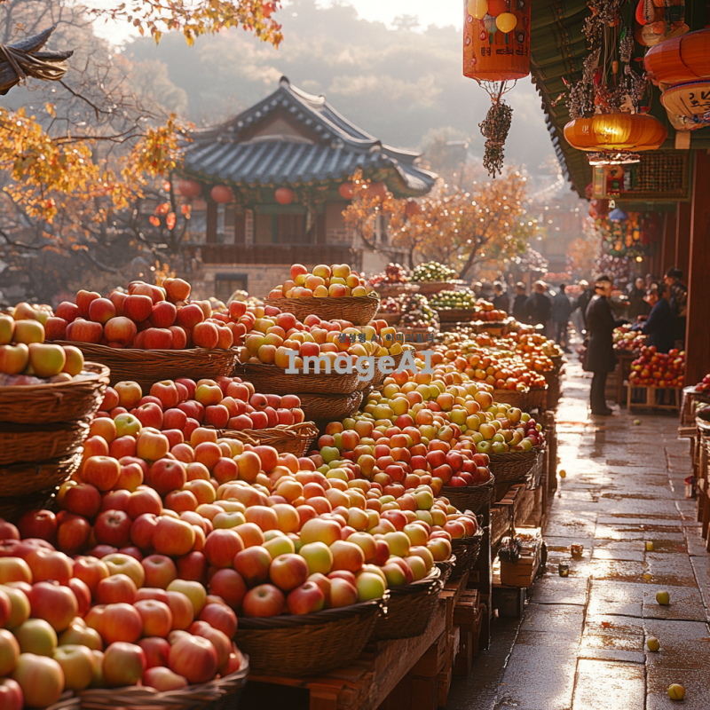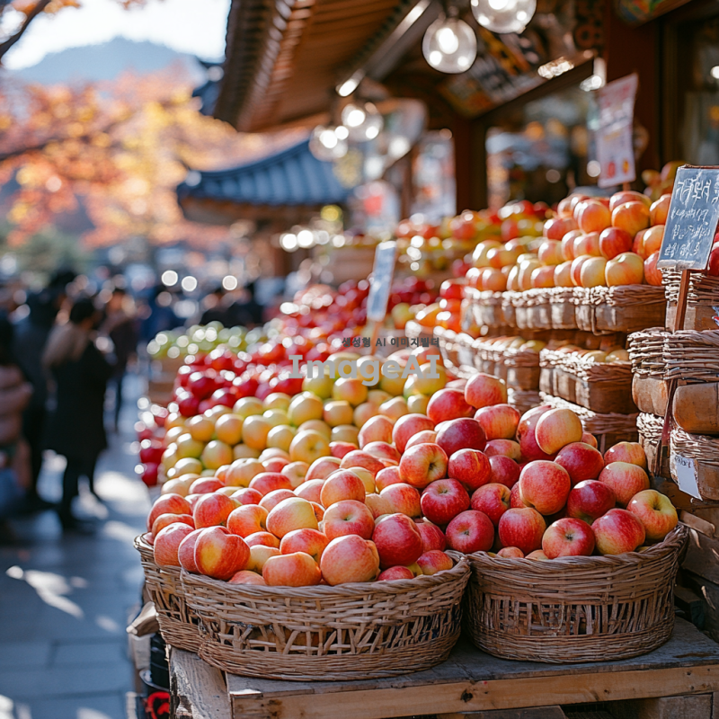 한국의 전통 시장에서 신선한 사과가 가득 쌓여 있는 모습. 다양한 색깔과 크기의 사과들이 햇빛에 반짝이며, 주변에는 바구니와 함께 진열된 모습. 시장의 활기찬 분위기와 사람들의 모습이 어우러진 장면. 배경에는 한국의 전통 건축물이 보이고, 따뜻한 가을 날씨를 느낄 수 있는 풍경.