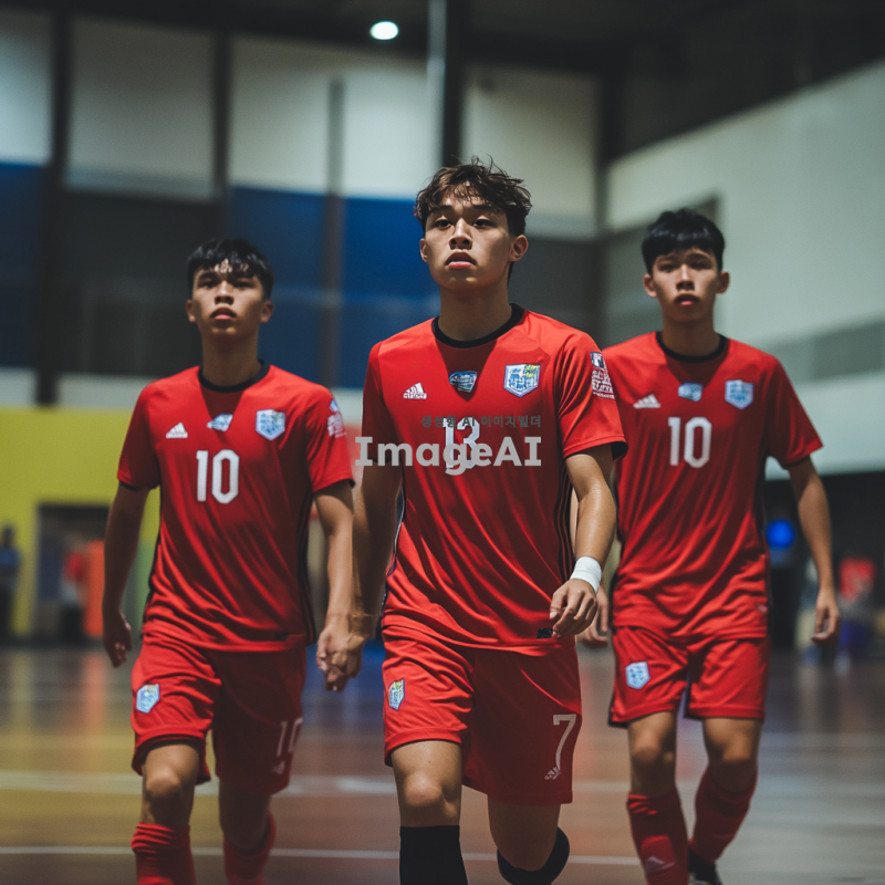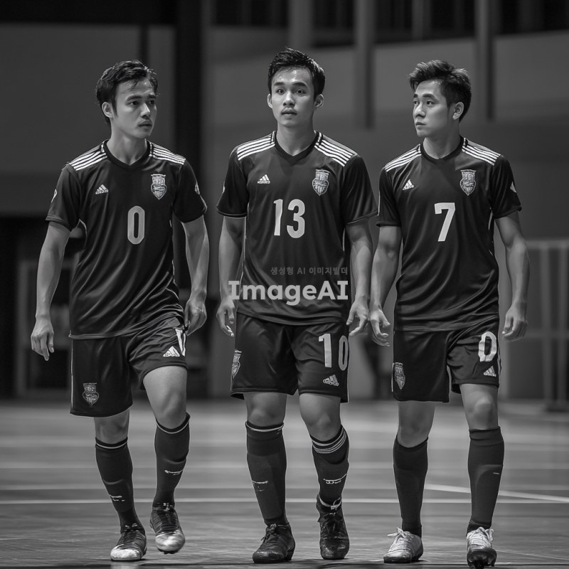 풋살장으로 들어가는 3명의 풋살 선수의 모습. 리더인 DOSA는 13번 유니폼을 입고 있으며, JACK CO는 10번, Y는 7번 유니폼을 입고 있다. 각 선수의 유니폼 상의와 하의에는 이름과 등번호가 선명하게 표시되어 있다. 세 선수는 비장한 표정으로 풋살장에 들어가고 있으며, DOSA가 특히 돋보이도록 강조되어 있다. 배경에는 풋살장이 보이고, 선수들의 자세는 결의에 차 있으며 팀워크를 느낄 수 있는 장면.