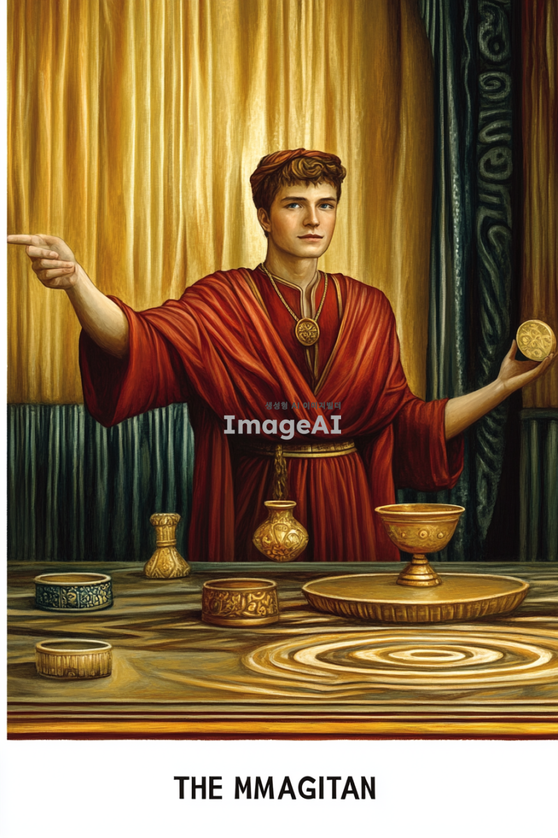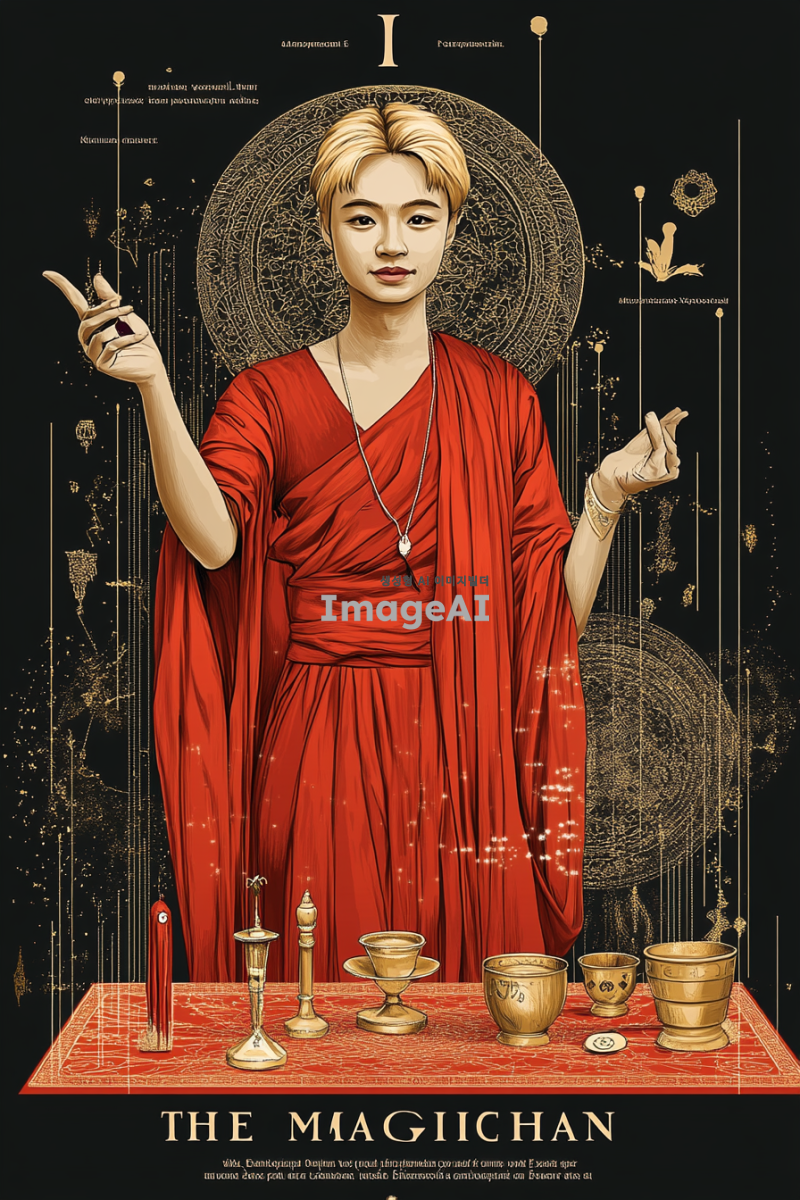 "타로 카드 '마법사(The Magician)' 일러스트. 주인공은 20대 젊은 남성으로, 차분하고 지혜로운 표정을 짓고 있음. 붉은색과 금색이 조화를 이루는 불교적인 분위기의 의복을 입음. 오른손은 하늘을 가리키고, 왼손은 땅을 가리키며, 우주의 진리를 현실에 적용하는 의미를 표현. 앞에 놓인 탁자에는 네 가지 상징적 도구(컵, 검, 동전, 지팡이)가 있으며, 이는 4원소를 나타냄. 배경에는 만다라나 연꽃 등 불교적인 문양이 은은하게 들어가 있어 영적인 느낌을 강조. 카드 상단에는 로마자 'I', 하단에는 'THE MAGICIAN'이라는 텍스트가 포함되어야 함. 전반적인 분위기는 신비롭고 고요한 느낌."