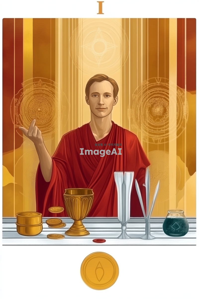타로 카드 '마법사' 일러스트. 주인공은 20대 젊은 남성으로 차분하고 지혜로운 표정을 짓고 있다. 붉은색과 금색이 조화를 이루는 불교적인 분위기의 의복을 입고 있으며, 오른손은 하늘을 가리키고 왼손은 땅을 가리키고 있다. 이는 우주의 진리를 현실에 적용하는 의미를 표현한다. 앞에 놓인 탁자에는 네 가지 상징적 도구(컵, 검, 동전, 지팡이)가 있으며, 이는 4원소를 나타낸다. 배경에는 만다라나 연꽃 등 불교적인 문양이 은은하게 들어가 있어 영적인 느낌을 강조한다. 카드 상단에는 로마자 'I', 하단에는 'THE MAGICIAN'이라는 텍스트가 포함되어 있다. 전반적인 분위기는 신비롭고 고요한 느낌이다.