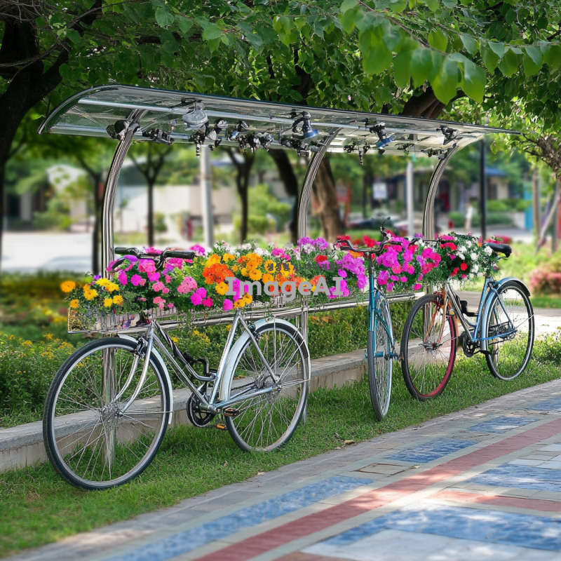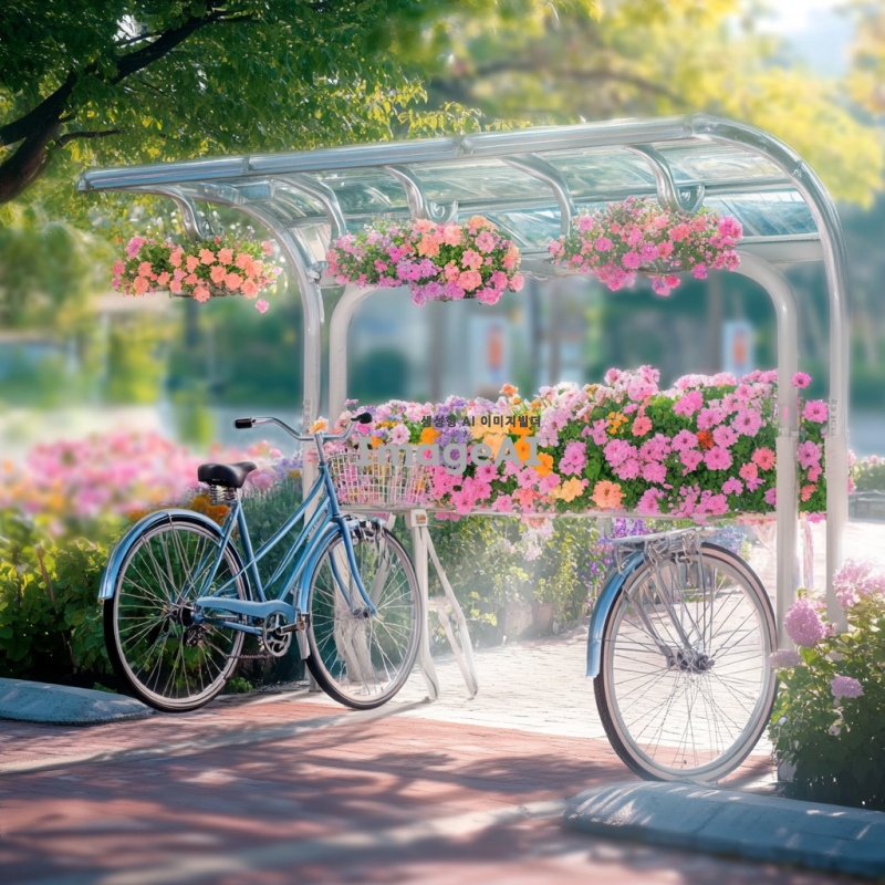 꽃과 어울려 있는 자전거 보관대, 다양한 색상의 꽃들로 장식된 자전거 보관대, 자연과 조화를 이루는 디자인, 햇살 아래에서 빛나는 자전거와 화사한 꽃들이 어우러진 풍경, 생동감 넘치는 정원 배경, 부드러운 색감과 따뜻한 분위기.