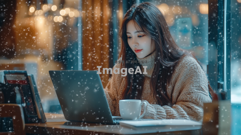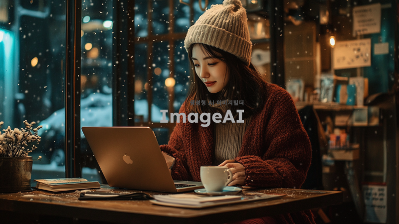 겨울 카페의 아늑한 분위기 속에서 여유롭게 커피를 마시며 노트북으로 작업하고 있는 20대 한국인 여성 인플루언서. 따뜻한 조명이 비추는 카페 내부, 창밖에는 눈이 softly 내리고 있으며, 그녀는 스타일리시한 겨울 패션을 입고 있다. 테이블 위에는 커피 잔과 노트북, 그리고 몇 권의 책이 놓여 있다.