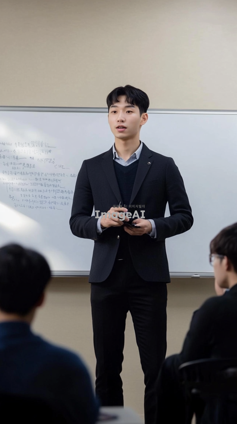 강의 중인 한국인 강사, 현대적인 강의실 배경, 학생들이 집중해서 듣고 있는 모습, 다양한 인종의 학생들, 화이트보드에 설명이 적혀 있는 장면, 자연광이 들어오는 창문, 전문적인 분위기, 교육적인 느낌 강조