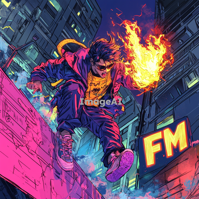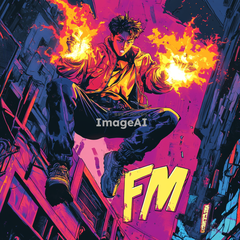 FM 글씨가 적힌 빌딩 위에서 뛰어내리는 한국인 개구쟁이, 주먹에서 불꽃이 타오르며 역동적인 포즈를 취하고 있는 모습, 도시의 배경과 함께 생동감 넘치는 색감으로 표현된 이미지.