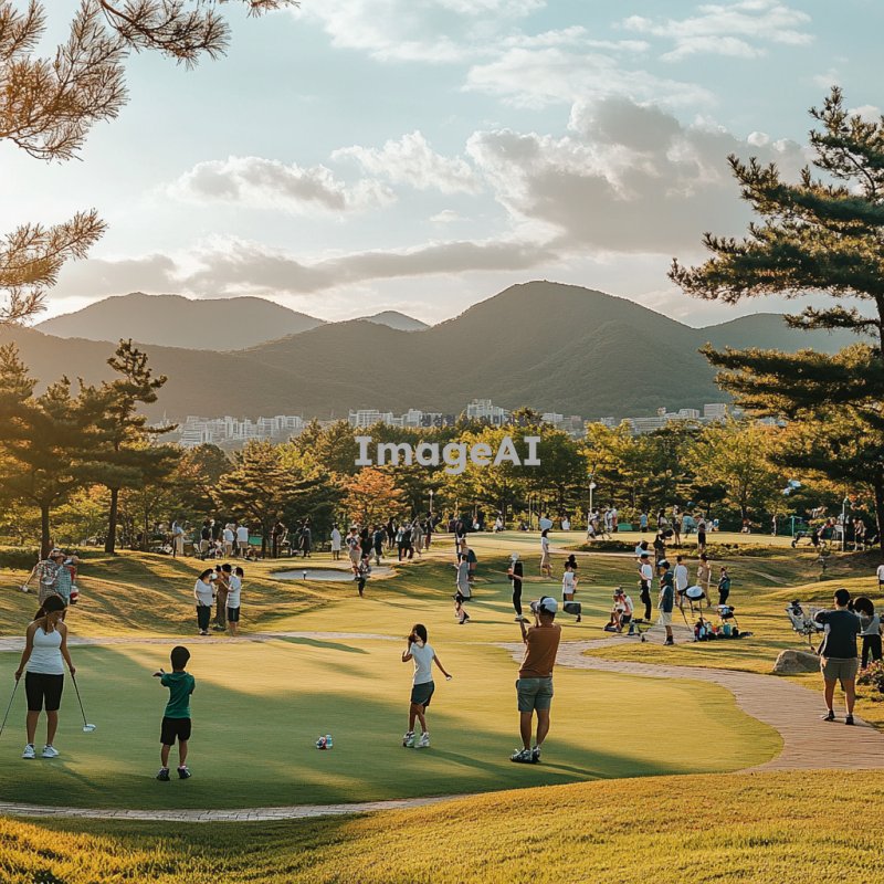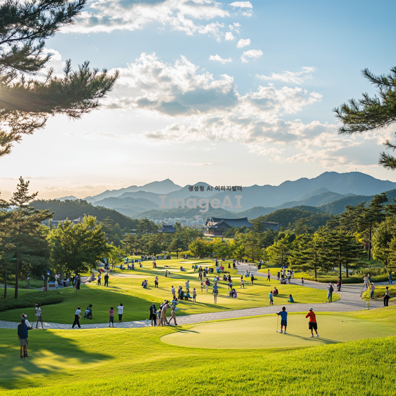 한국의 아름다운 공원에서 파크골프를 즐기는 사람들, 푸른 잔디밭과 나무들로 둘러싸인 경치, 햇살이 비치는 따뜻한 날씨, 다양한 연령대의 사람들이 활짝 웃으며 골프채를 휘두르는 모습, 즐거운 분위기와 함께하는 가족 및 친구들, 배경에는 멀리 산과 구름이 보이는 풍경.
