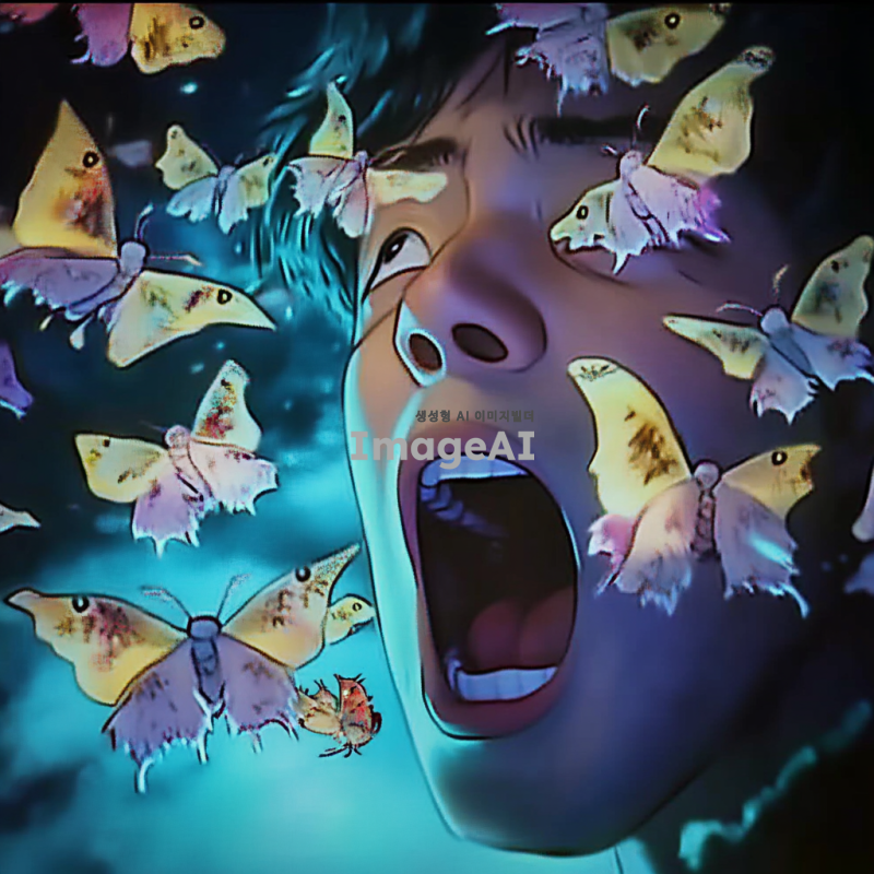 입에서 나방이 나오는 장면을 그린 이미지, 한국인 남성이 놀란 표정을 짓고 있는 모습, 어두운 배경에 신비로운 조명 효과, 나방은 다양한 색상과 패턴을 가진 생동감 있는 모습, 입에서 나오는 나방들이 공중에서 날아오르는 모습, 초현실적이고 몽환적인 분위기.