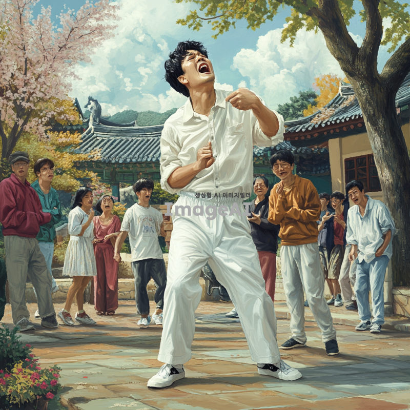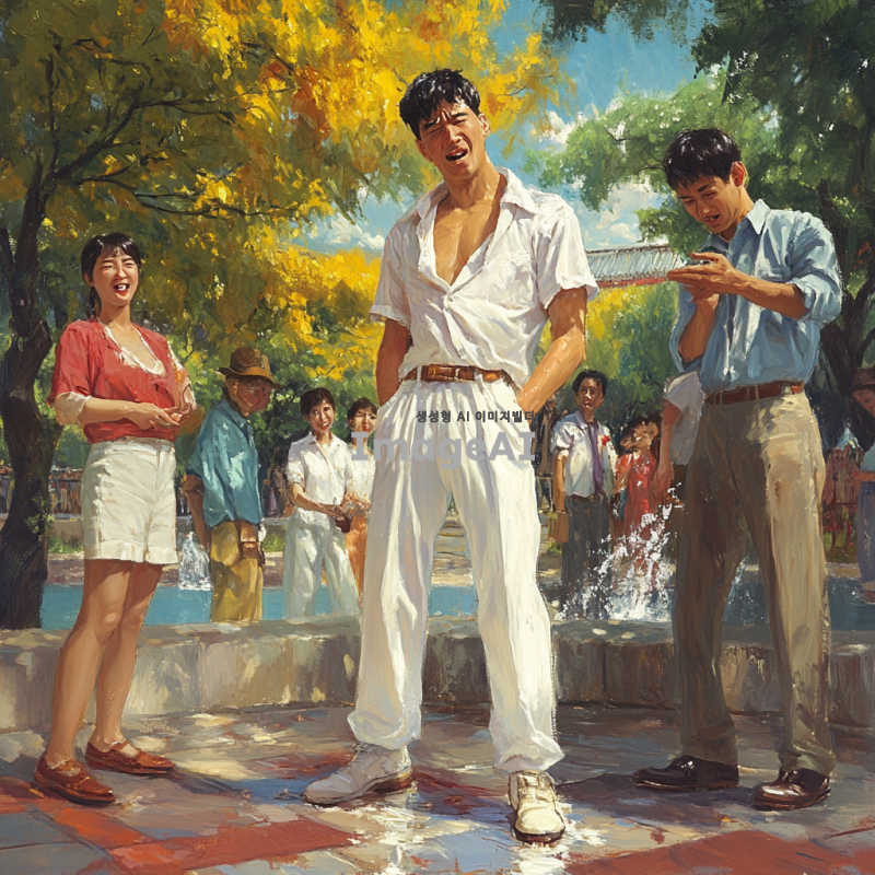 한 남자가 바지에 오줌을 싼 상황을 겪고 있는 모습, 당황한 표정과 함께 주변 사람들의 놀란 반응이 담긴 장면, 도심의 공원 배경, 자연스러운 색감과 생동감 있는 분위기, 한국인 남성, 캐주얼한 흰색바지, 상황의 유머러스한 요소를 강조.