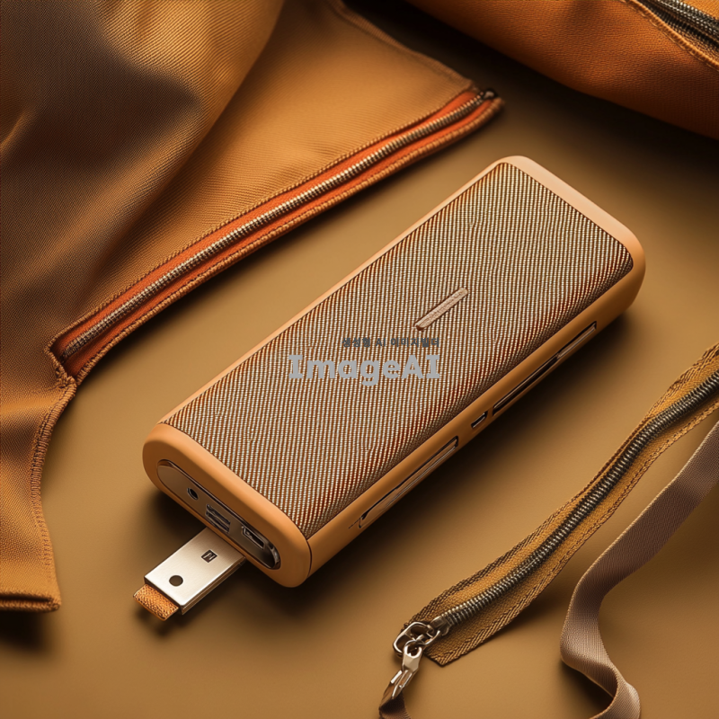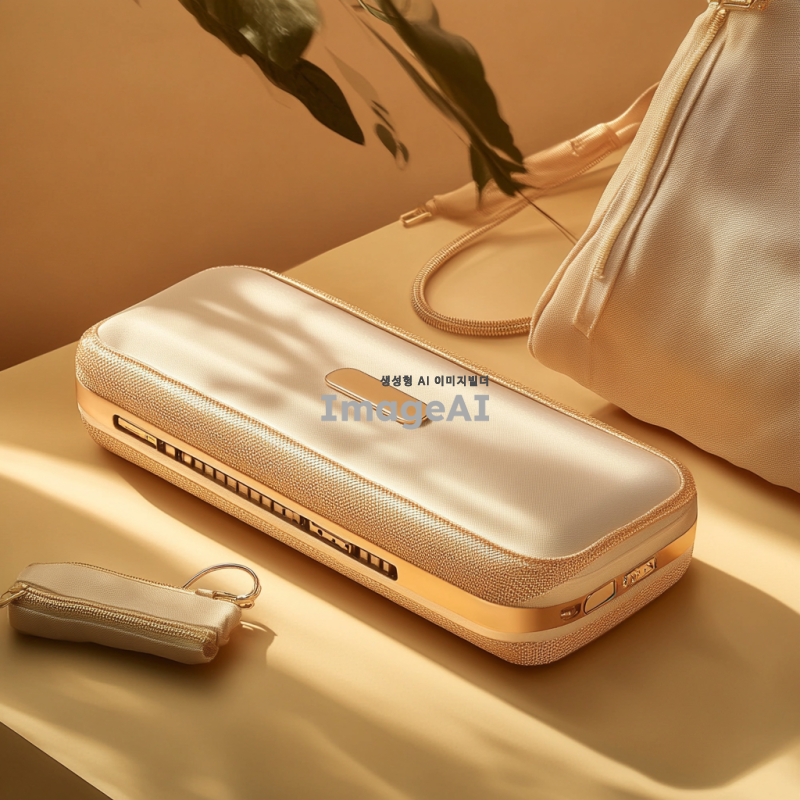 보조배터리에 절연테이프가 감싸져 있는 모습, 단자가 금속과 접촉하지 않도록 보호되고 있는 장면, 주변에는 보호용 파우치와 지퍼백이 함께 놓여 있는 배경, 안전하게 보관되는 느낌을 주는 따뜻한 조명, 한국인 스타일의 보조배터리 디자인, 세부적인 텍스처와 색상 강조.