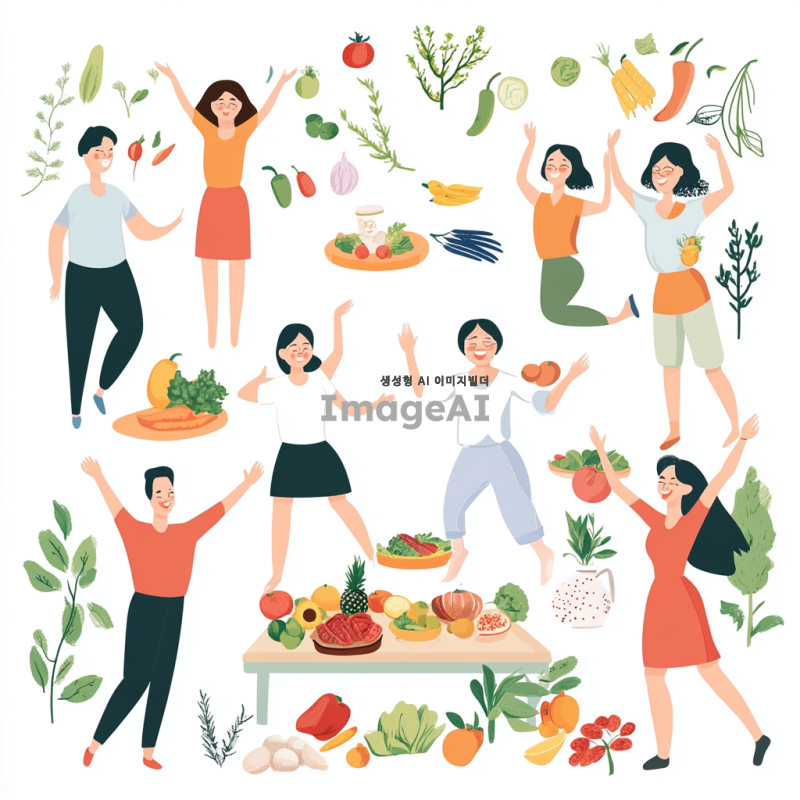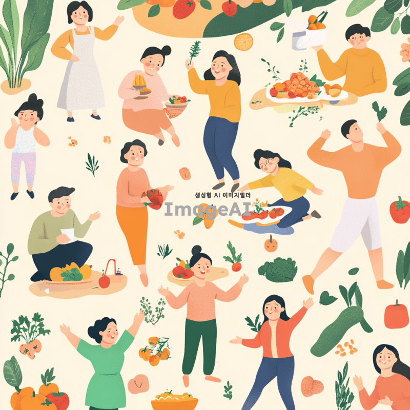 건강의 개념을 시각적으로 표현한 이미지. 다양한 연령대의 한국인들이 함께 운동하고, 건강한 음식을 나누며, 웃고 있는 모습. 자연 속에서 즐거운 시간을 보내는 모습, 신선한 과일과 채소가 가득한 식탁, 요가를 하는 사람들, 그리고 긍정적인 에너지를 느끼는 표정들. 건강한 삶의 여러 측면을 포괄적으로 나타내는 따뜻하고 활기찬 분위기.