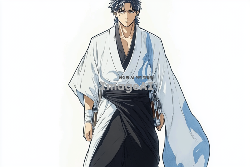 진격의 거인 캐릭터, 흰색과 파란색 로브에 검은 바지를 입고 있는 캐릭터 디자인, 전신 샷, 애니메이션 스타일, 간단한 배경, 그림자 없음, 이미지에 텍스트나 글자가 없음. 목업 없이 명확한 윤곽과 머리카락, 뚜렷한 선으로 그려진 흰색 배경.