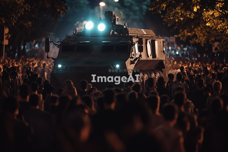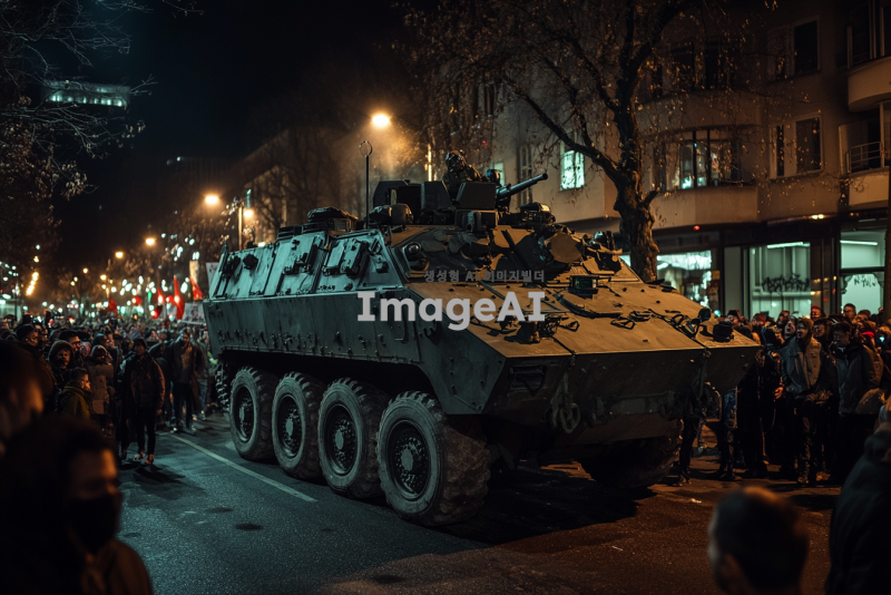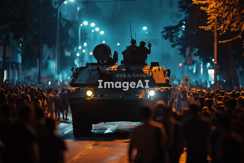 밤에 촬영된 이미지로, 탱크 또는 장갑차와 같은 장갑 군용 차량이 큰 인파에 둘러싸여 있는 장면. 사람들은 시위나 집회와 관련된 상황에 참여하고 있으며, 긴장감이 감도는 분위기를 표현. 주변은 어두운 조명 아래에서 사람들의 표정과 차량의 강렬한 모습이 강조되어 있다.