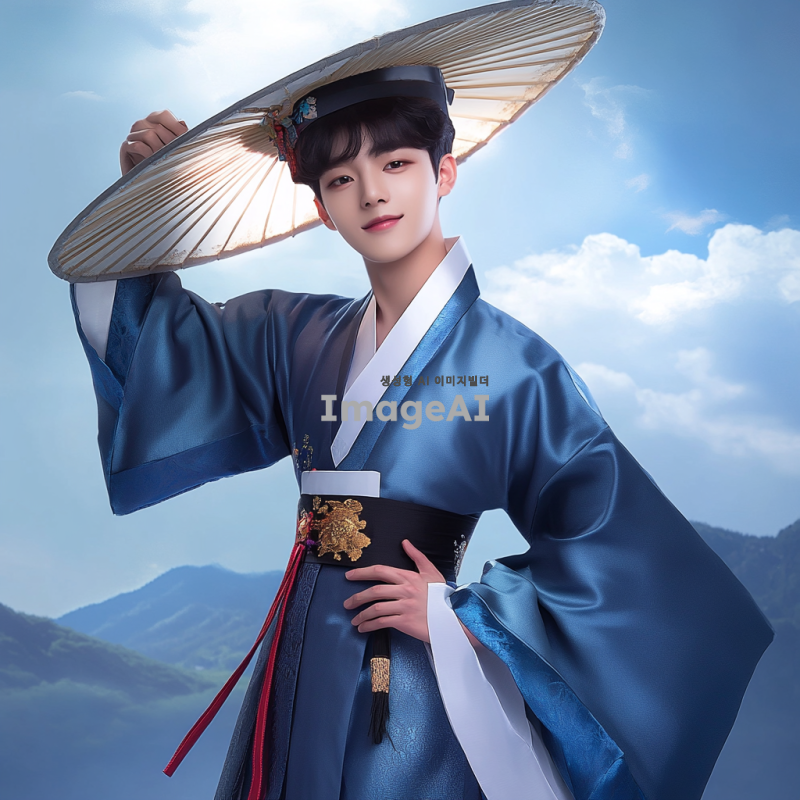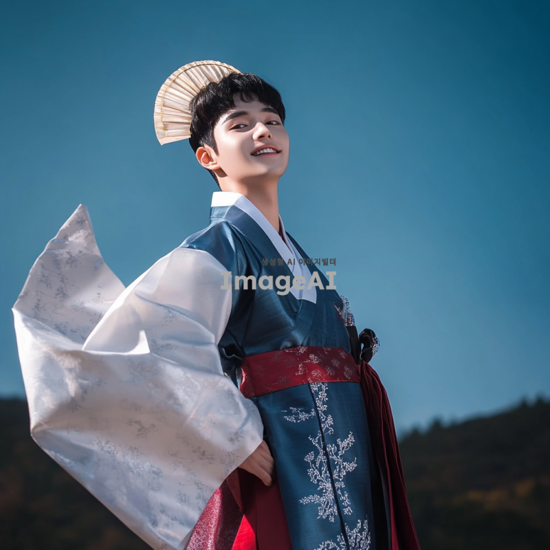 한국의 전통 의상을 입은 젊은 남성 캐릭터, 밝은 미소와 함께 자신감 넘치는 포즈, 배경은 아름다운 한국의 자연 풍경, 푸른 하늘과 산, 따뜻한 햇살이 비치는 모습, 세련된 헤어스타일과 현대적인 액세서리, 친근하고 매력적인 분위기, 생동감 넘치는 색감.