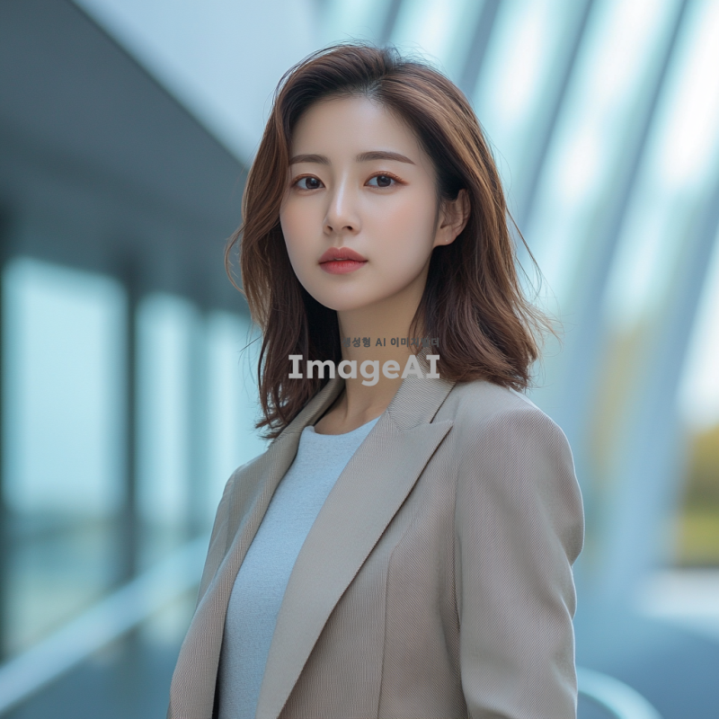현대적인 도시 배경에서 자신감 넘치는 표정으로 서 있는 젊은 한국 여성의 모습, 세련된 패션 스타일과 자연스러운 헤어스타일, 전문적인 분위기를 강조하는 포즈, 밝고 선명한 색감, 현대적인 건축물과 함께 조화를 이루는 배경.