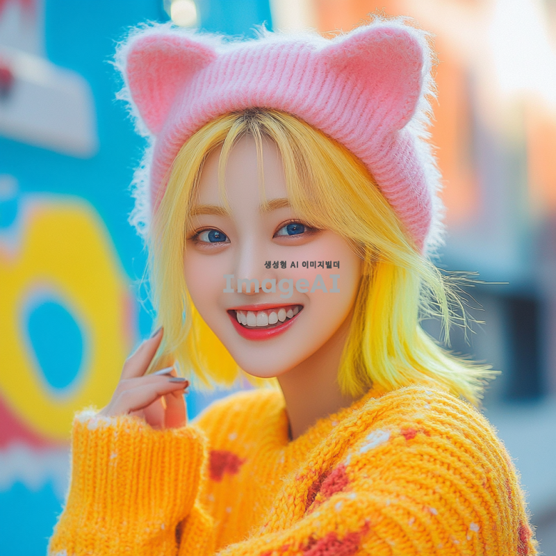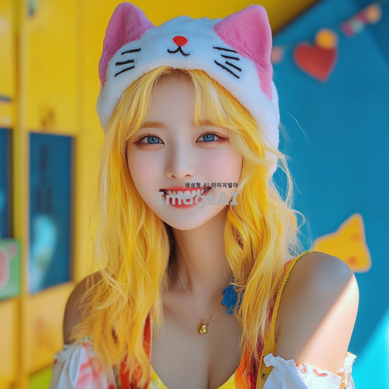고양이 모자를 쓴 한국인 여성, 노란 머리와 파란 눈을 가진 아이돌 같은 느낌의 이미지. 밝고 화사한 배경, 귀여운 포즈로 미소 짓고 있는 모습. 스타일리시한 의상과 함께 고양이 모자의 디테일이 잘 보이도록.