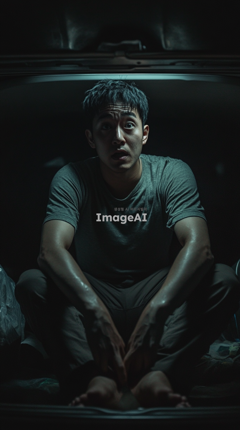 어두운 밤, 승용차 트렁크 안에 갇힌 한국인 남성이 혼자 앉아 있다. 그의 표정은 두려움과 불안으로 가득 차 있으며, 주변은 어둡고 음산한 분위기이다. 트렁크의 내부는 좁고 폐쇄된 공간으로, 희미한 빛이 들어오고 있다. 남성은 두 손으로 무릎을 감싸고 있으며, 눈은 크게 뜨고 주위를 살피고 있다.