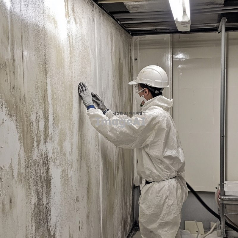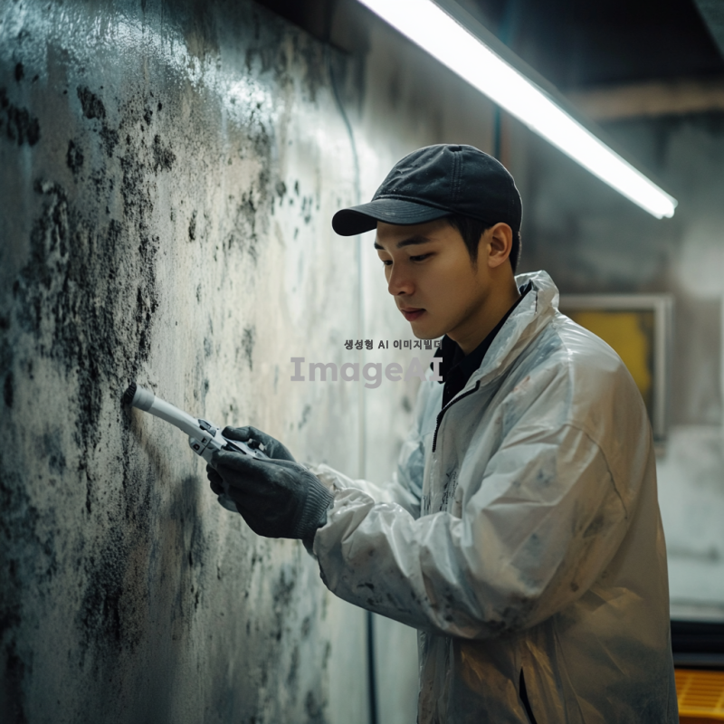 곰팡이가 제거되는 과정 중인 벽면, 밝은 조명 아래에서 전문적인 장비를 사용하여 곰팡이를 청소하는 한국인 기술자, 깨끗하고 정돈된 작업 공간, 벽면의 곰팡이가 사라지는 모습, 청결과 안전을 강조하는 분위기, 실제적인 작업 환경, 고해상도.