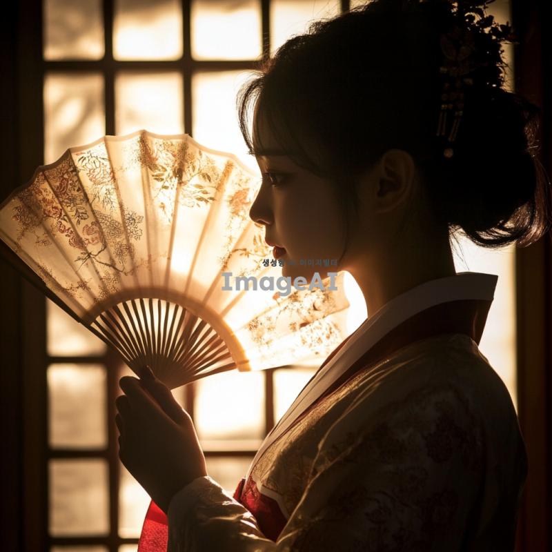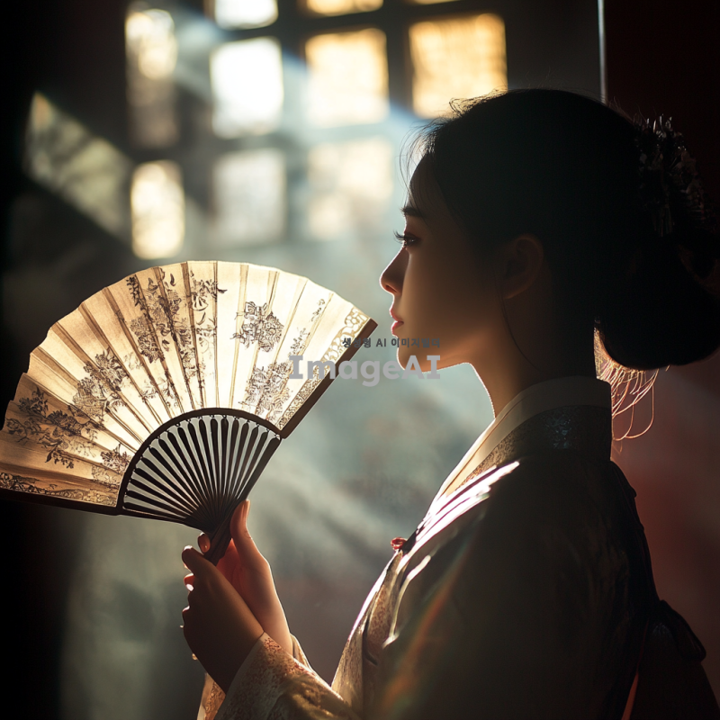 역광에서 부채를 들고 있는 한국인 여성의 모습을 그려주세요. 부채를 통해 비치는 배경의 물체들이 선명하게 드러나도록 해주세요. 부채는 섬세한 문양이 새겨져 있고, 여성은 전통 한복을 입고 있습니다. 부채의 그림자와 빛의 반사 효과가 강조되도록 하여, 전체적인 분위기가 신비롭고 우아하게 느껴지도록 만들어주세요.