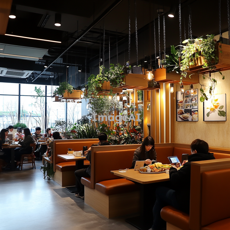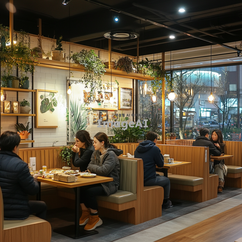 한국의 현대적인 구내식당 내부, 다양한 음식을 제공하는 부스와 테이블, 직원들이 친절하게 손님을 맞이하는 모습, 따뜻한 조명 아래에서 사람들이 식사하는 장면, 식사 후 대화하는 모습, 깨끗하고 아늑한 분위기, 벽에는 식물 장식과 현대적인 아트워크가 있는 공간.