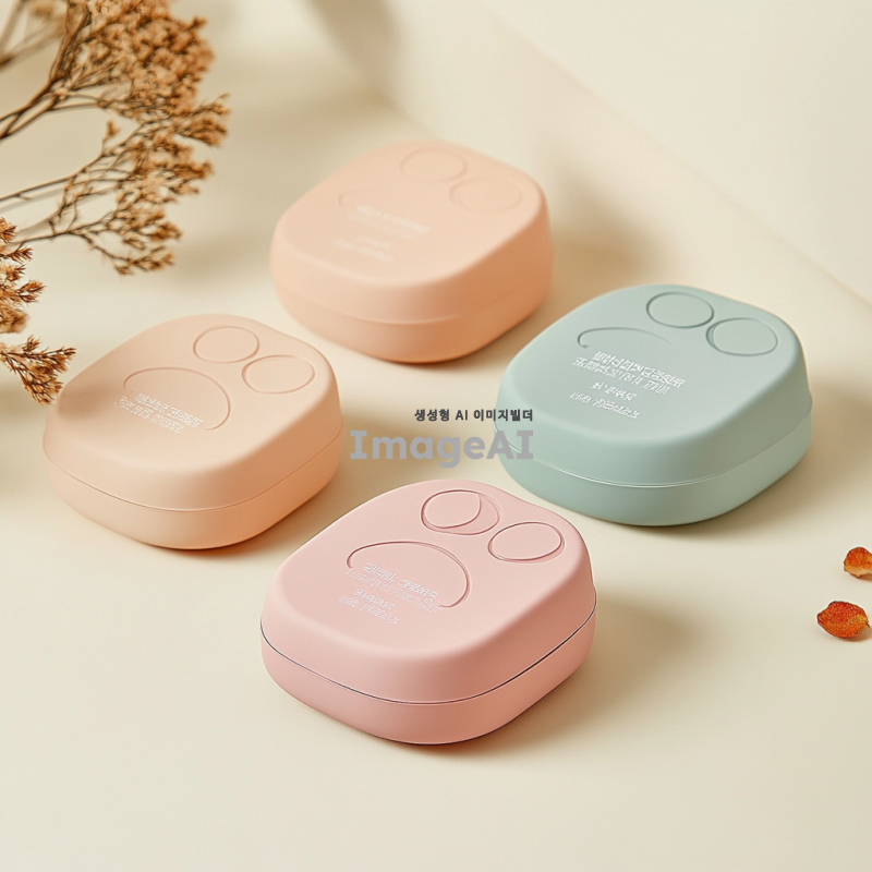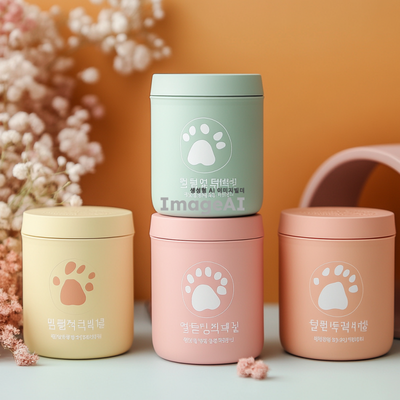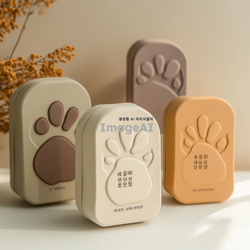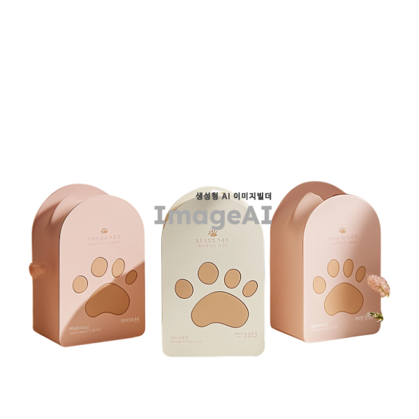 강아지 발바닥 보습팩 디자인, 귀엽고 아기자기한 스타일, 강아지 발바닥 모양의 패키지, 부드러운 색상 조합, 자연 친화적인 재료 강조, 사용법 설명이 포함된 라벨 디자인, 따뜻하고 사랑스러운 느낌의 배경, 한국적인 요소를 가미한 디자인