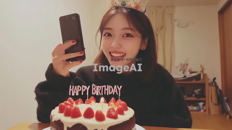 한국 여성 한 명이 생일 케이크가 앞에 놓인 테이블에 앉아 웃고 있으며, 머리에 왕관을 쓰고 있습니다. 그녀는 전화를 들고 "HAPPY BIRTHDAY" 사인을 만들며 셀카를 찍고 있습니다. 그녀는 검은 스웨터를 입고 있으며, 배경은 작고 깔끔한 스타일의 방입니다. 이 여성은 아름다운 20세 한국 소녀이며, 케이크는 초콜릿 퐁듀 층 위에 딸기 조각으로 장식되어 있고 촛불이 켜져 있습니다.