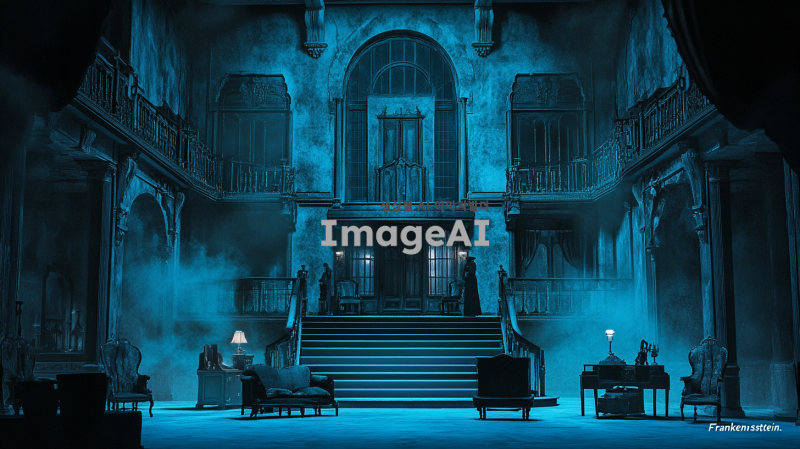 어두운 분위기의 고딕 양식의 실내 배경, 웅장한 성의 내부, 석조 벽과 고풍스러운 조명, 음침한 분위기 속에 미세한 안개가 감도는 모습, 중앙에 큰 계단이 있고, 고전적인 가구와 장식품들이 배치된 장면, 뮤지컬 "프랑켄슈타인"의 분위기를 살리기 위해 신비로운 느낌을 강조한 이미지.