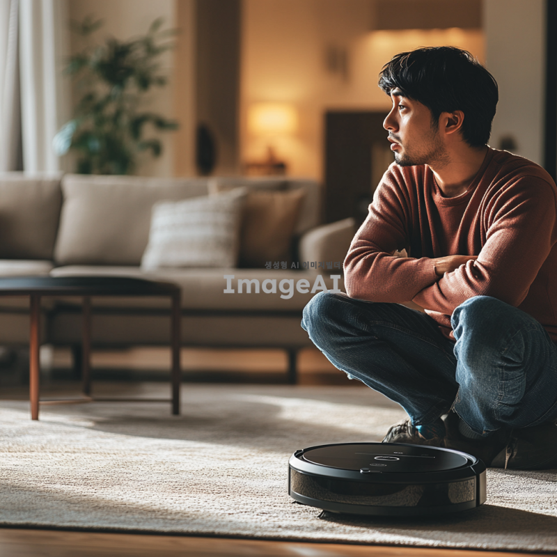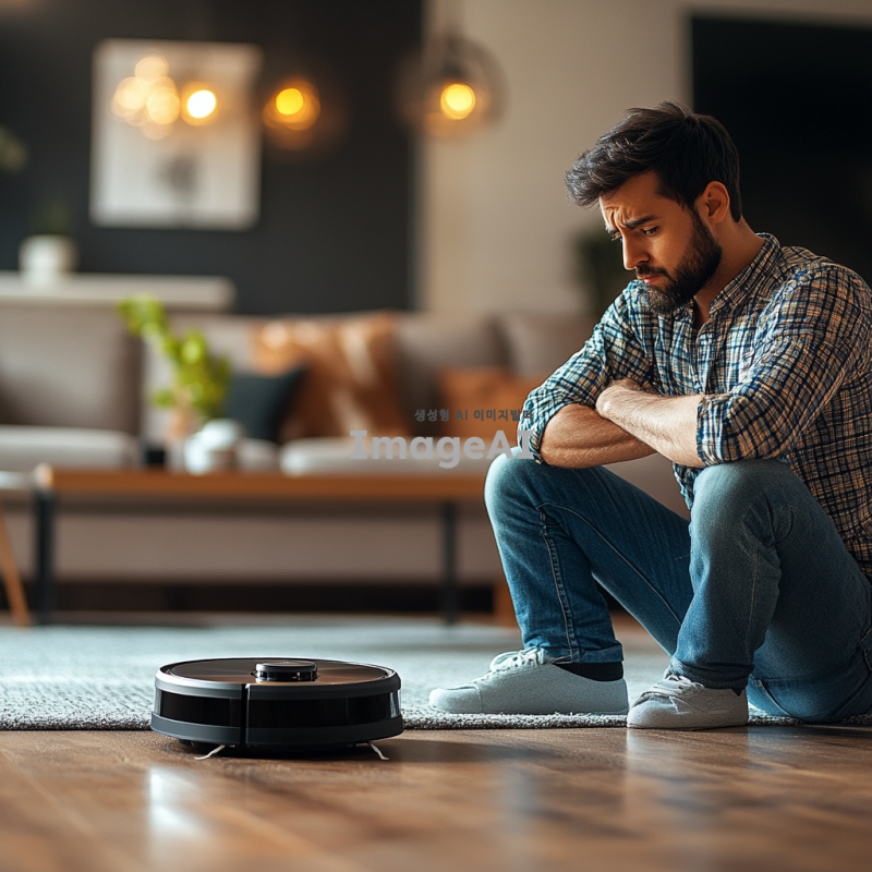 로봇청소기가 느리게 청소하는 모습을 지켜보며 답답해하는 외국인 남성. 집안은 깔끔하지만 로봇청소기가 한 곳에서 머물며 청소하는 모습. 남성은 팔짱을 끼고 불만스러운 표정을 짓고 있으며, 배경에는 거실의 소파와 커피 테이블이 보인다. 조명은 따뜻하고 아늑한 분위기를 연출하고 있다.