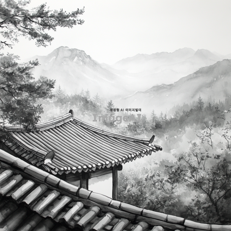 수묵화 스타일의 흑백 그림으로 표현된 한국의 전통 풍경, 고택과 자연이 어우러진 모습, 부드러운 선과 음영을 강조하여 고요하고 평화로운 분위기를 자아내는 장면, 전통 한옥의 지붕과 주변의 산과 나무들이 어우러진 풍경.