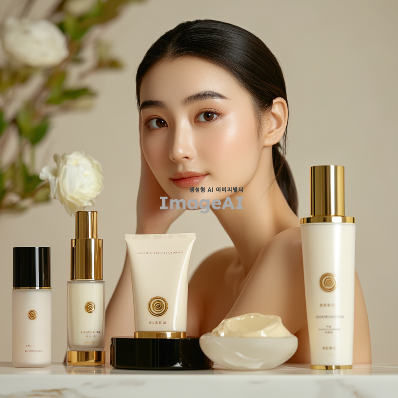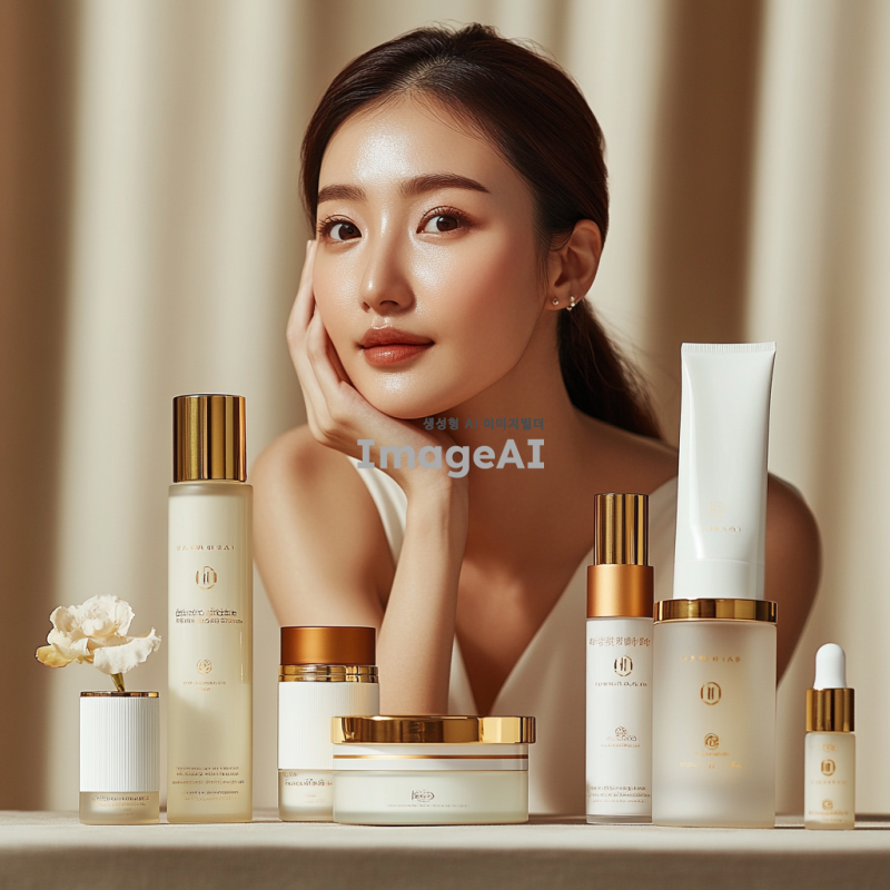 동양인 여성 모델이 다양한 스킨케어 제품을 사용하며 피부를 관리하는 모습, 자연광 아래에서 촬영된 세련된 스튜디오 배경, 부드러운 표정과 건강한 피부, 고급스러운 스킨케어 제품들이 배치된 장면, 현대적이고 세련된 느낌의 스타일링, 피부의 질감이 잘 드러나는 클로즈업 샷.