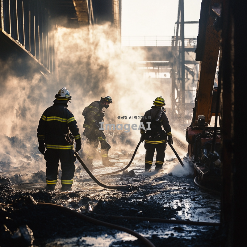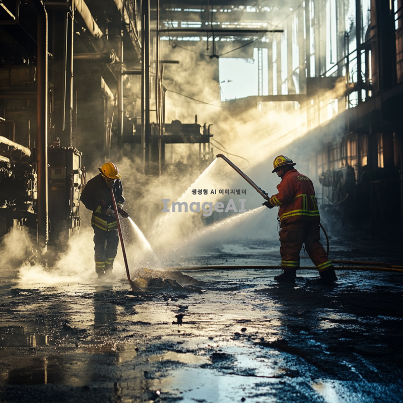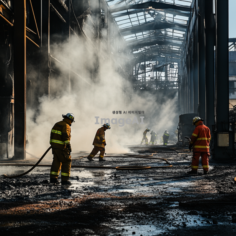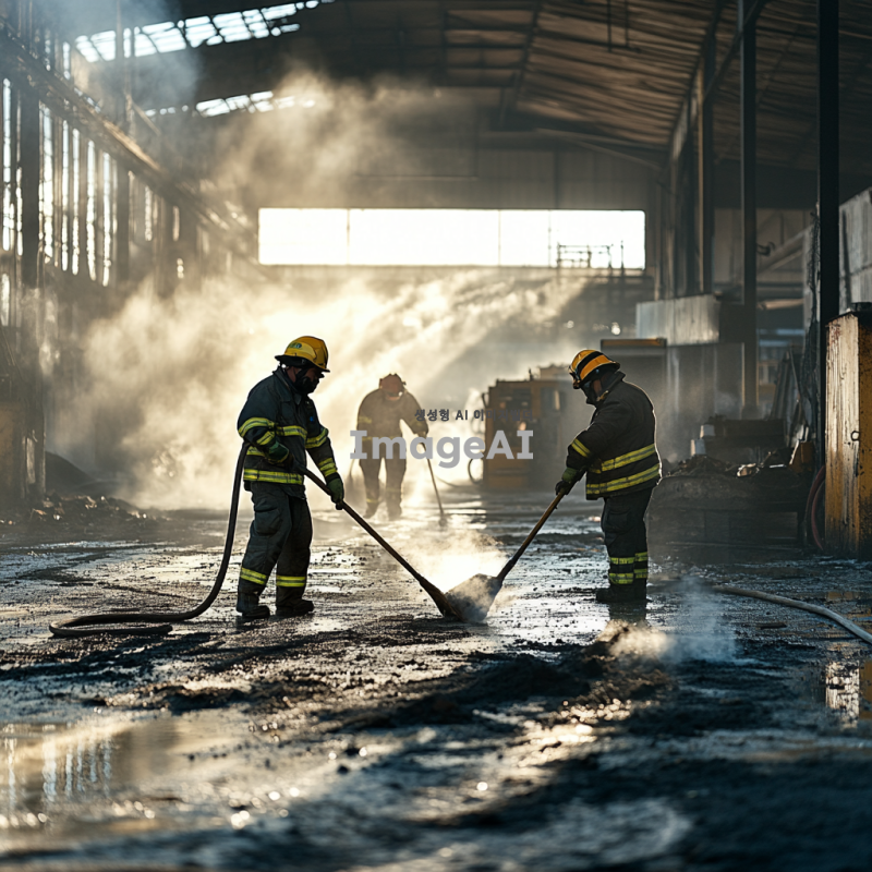 공장에서 화재 후 청소 작업을 진행하는 모습, 소방관들이 화재 잔해를 치우고 있는 장면, 다양한 청소 장비와 보호 장구를 착용한 작업자들, 주변에 연기와 재가 남아 있는 환경, 햇빛이 비추는 가운데 집중해서 일하는 모습, 산업 현장의 긴장감과 협동의 분위기를 담아낸 이미지.