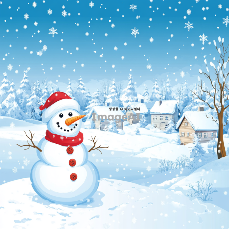 눈사람이 서 있는 겨울 풍경, 하얀 눈으로 덮인 나무와 집들이 배경에 있으며, 눈사람은 당근 코와 버튼으로 장식되어 있고, 빨간색 목도리를 두르고 있다. 맑은 파란 하늘 아래 따뜻한 햇살이 비추고 있는 모습, 주변에는 눈송이가 천천히 내리고 있는 장면.