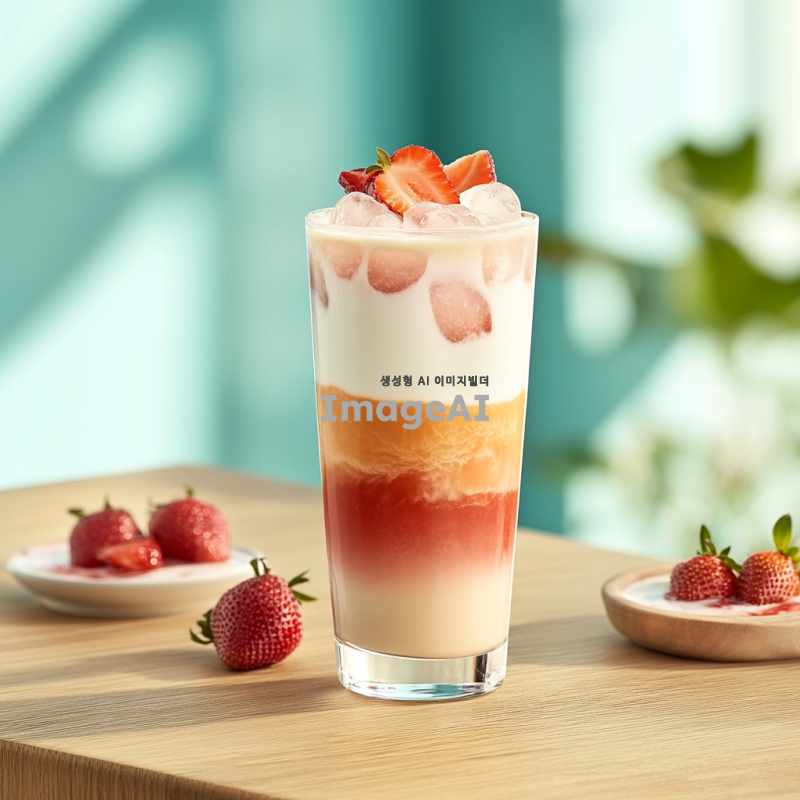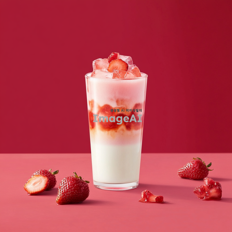 유리잔에 담긴 딸기라떼, 얼음이 살짝 비치고, 음료의 밑에서 2분의 1 지점까지는 부드러운 우유로 가득 차 있으며 그 위에는 달콤한 딸기 시럽이 올려져 있는 모습. 두 층의 경계가 흐트러져 자연스럽게 어우러진 느낌을 강조하여, 상큼하고 맛있는 분위기를 담아낸 이미지.
