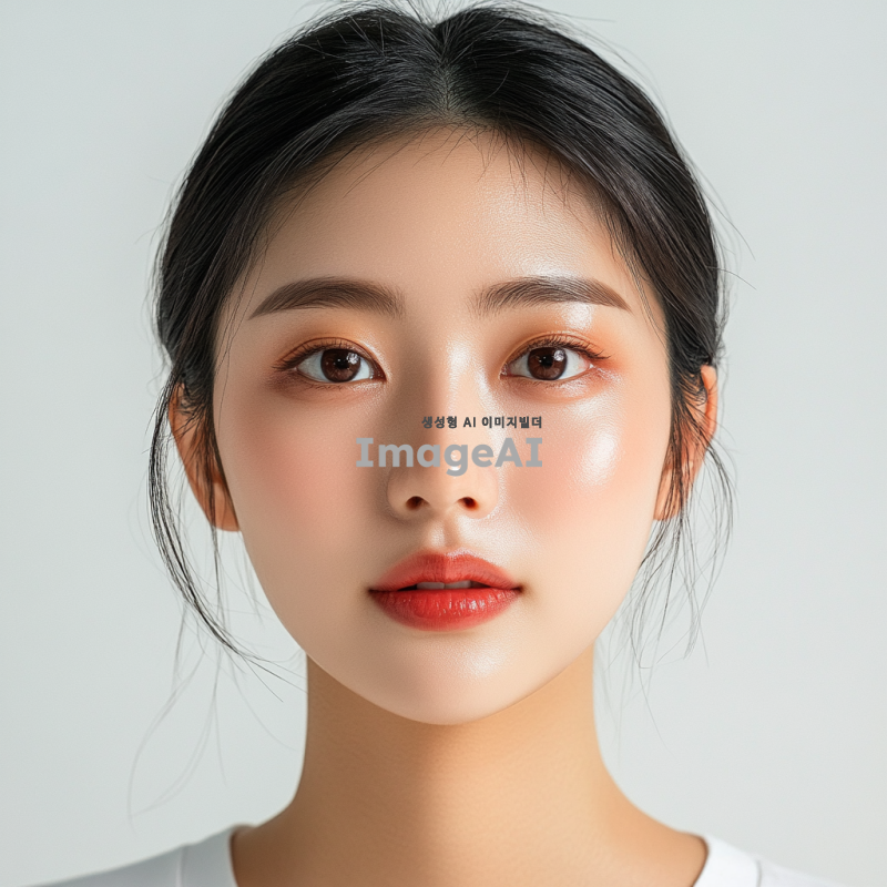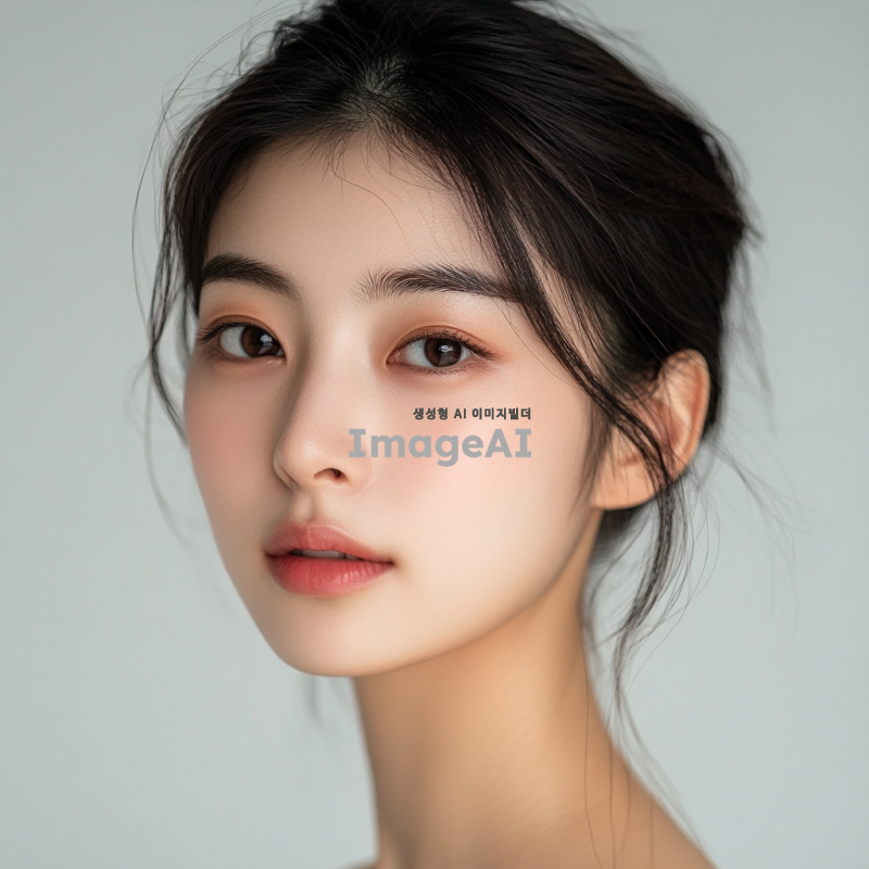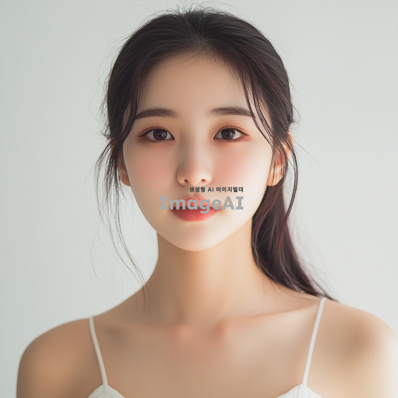 화장품 모델로서 자연광 아래에서 하얀 배경을 배경으로 한 한국 20대 여성의 상반신 이미지. 긴 머리를 가진 여성의 부드러운 표정과 자연스러운 메이크업을 강조하여 화장품의 매력을 전달하는 모습.