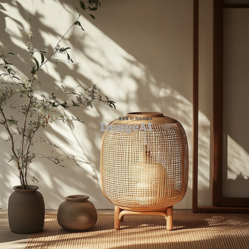 라탄으로 만들어진 아름다운 받침, 자연스러운 색감과 질감이 돋보이는 디자인, 한국의 전통적인 요소가 가미된 형태, 실내 인테리어에 잘 어울리는 스타일, 따뜻하고 아늑한 분위기를 연출하는 소품, 부드러운 조명 아래에서의 모습, 세밀한 디테일과 정교한 마감 처리 강조.
