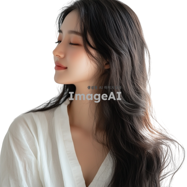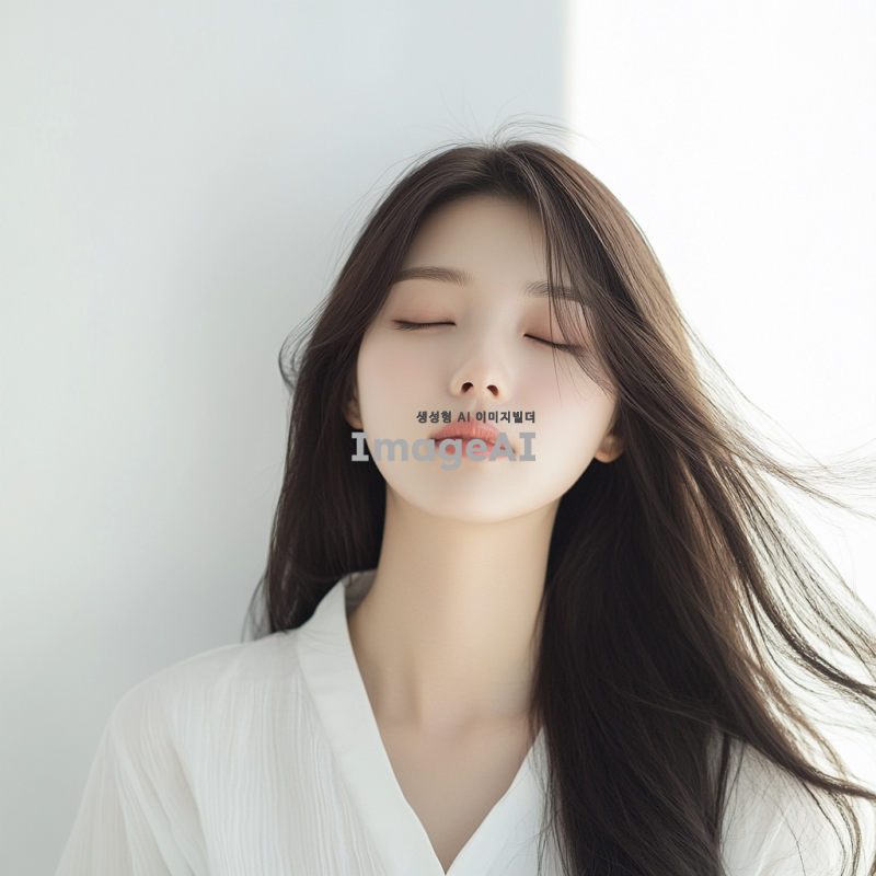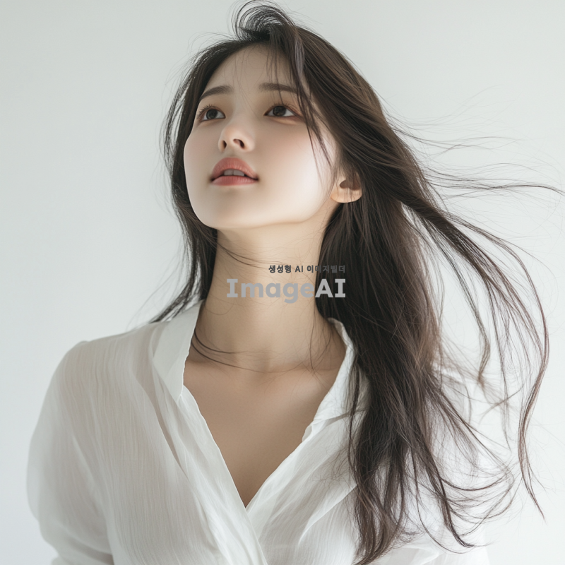 흰 옷을 입고있는 아름다운 20대 한국 여성의 상반신 모습, 자연광의 하얀색 배경, 하얗고 밝고 투명한 피부, 자연스러운 메이크업, 부드러운 표정, 긴 머리는 자연스럽게 흘러내림, 편안한 분위기,