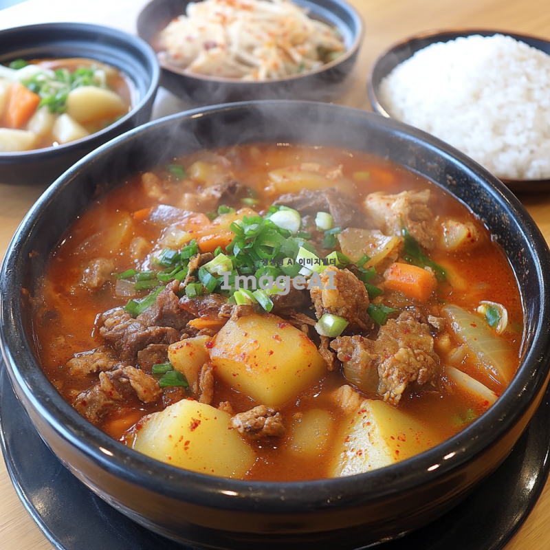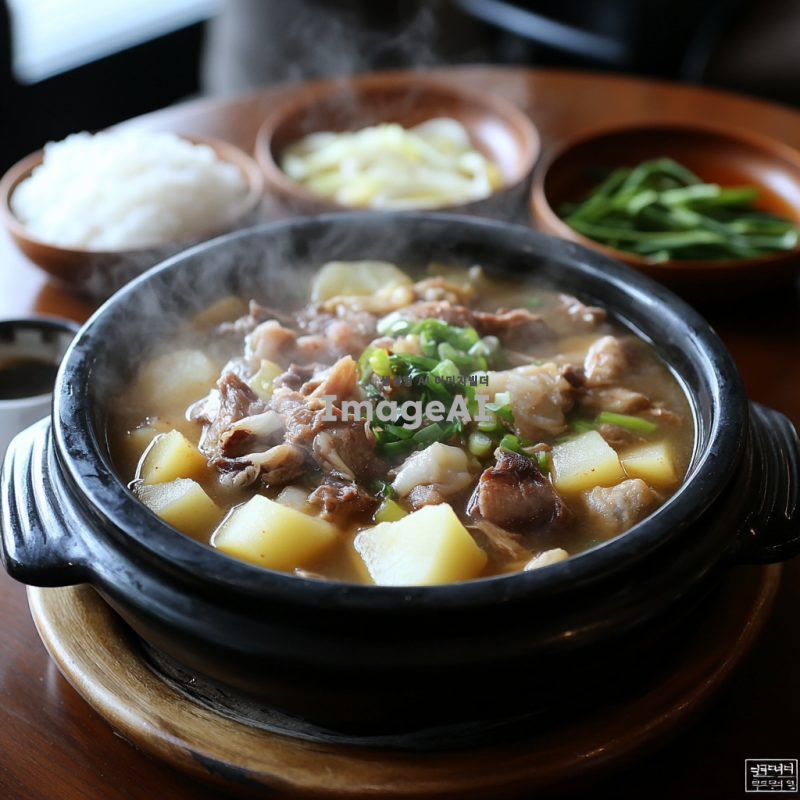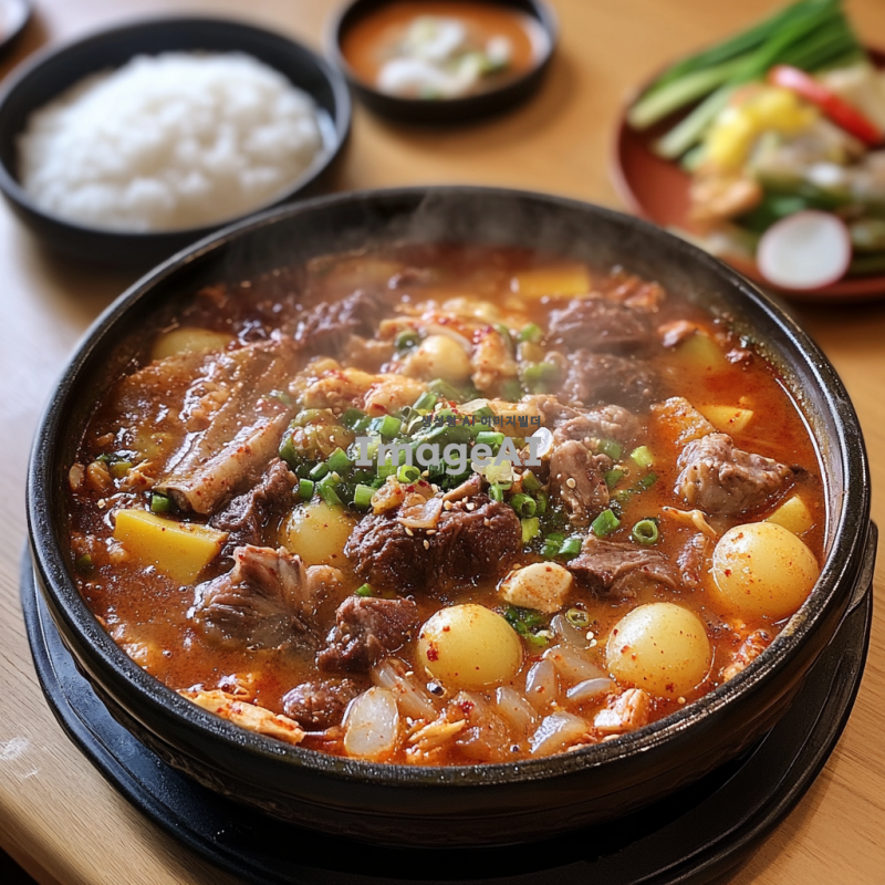 한국 전통 음식인 곱도리탕을 중심으로, 맛있게 조리된 곱도리탕의 모습. 진한 국물에 다양한 재료가 어우러져 있는 모습, 매콤한 양념이 가득한 식탁 위의 아름다운 플레이팅. 주변에 김이 모락모락 나는 밥과 함께, 따뜻한 분위기의 한국식 식사 환경을 강조. 조리 과정에서의 신선한 재료들, 예를 들어 곱창, 닭고기, 감자, 대파 등이 함께 담긴 이미지.