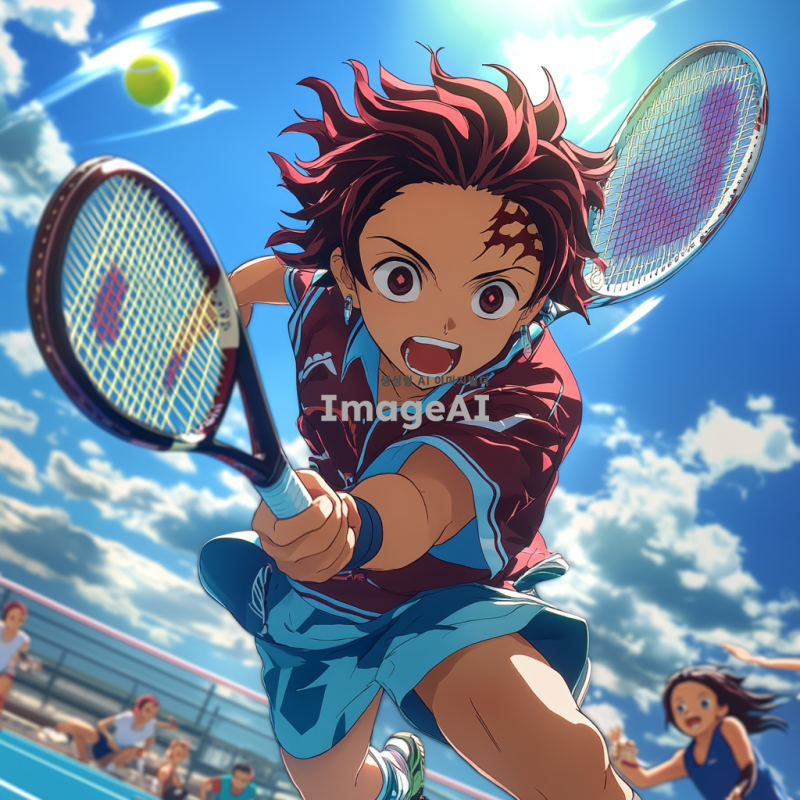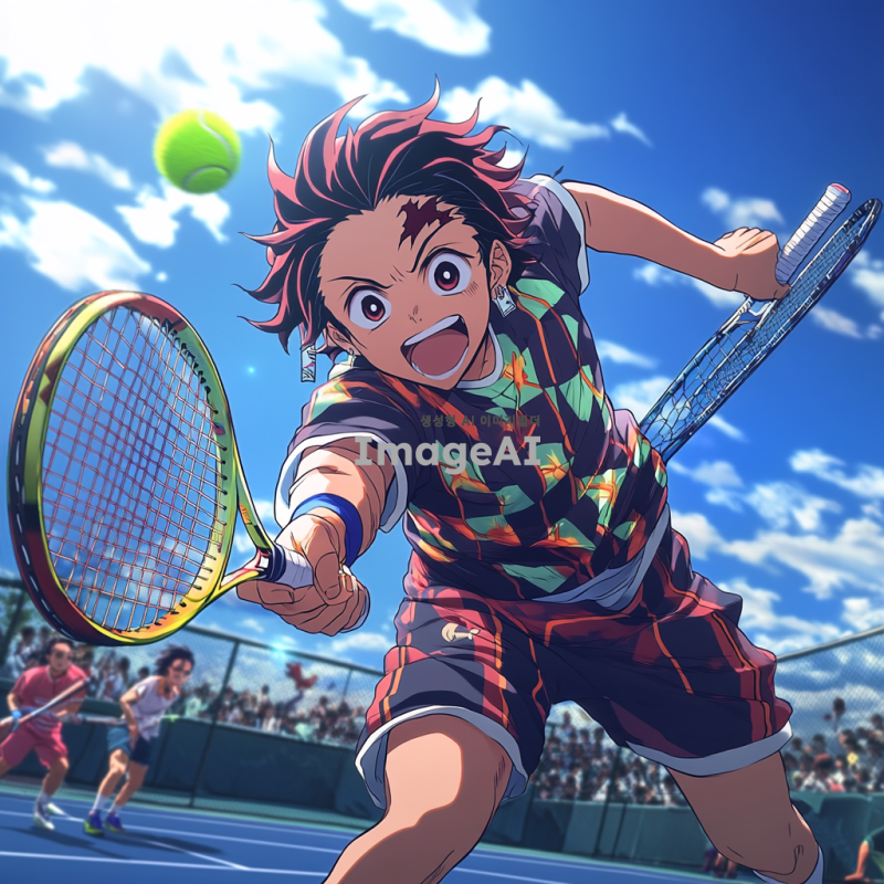 테니스 코트에서 테니스를 치고 있는 귀멸의 칼날의 탄지로, 밝고 활기찬 분위기, 운동복을 입고 라켓을 들고 있는 모습, 배경에는 푸른 하늘과 구름, 주변에는 친구들과 함께하는 즐거운 장면, 애니메이션 스타일, 세밀한 표정과 역동적인 자세 강조