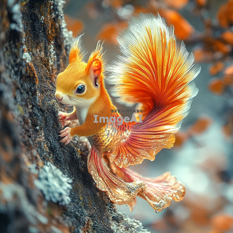 다람쥐와 물고기를 합친 생물, 귀여운 외모의 생물체, 다람쥐의 털과 물고기의 비늘이 조화롭게 섞인 모습, 나무 위에서 수영하는 장면, 자연의 배경, 밝고 생동감 있는 색감, 환상적인 분위기