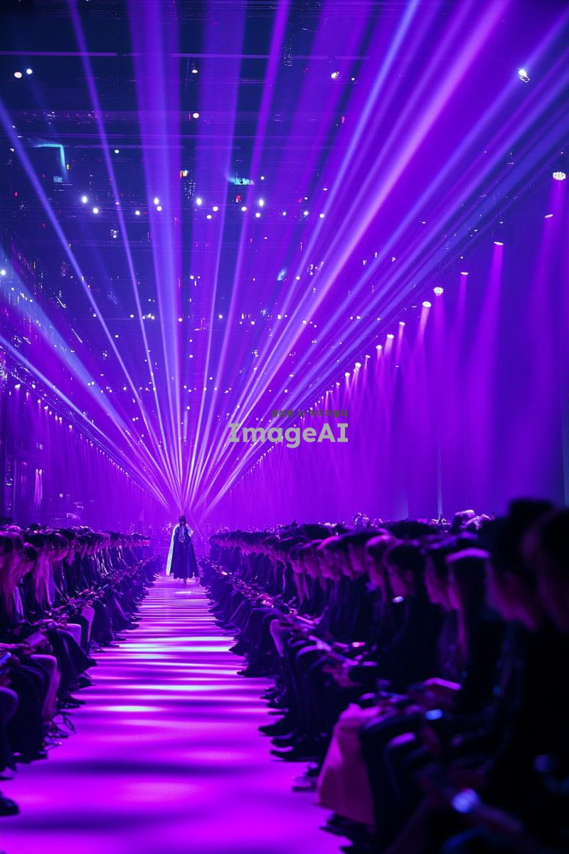 패션 브랜드들이 함께 모여서 서바이벌 경연 프로그램을 펼치고 있는 장면을 그려줘. 모바일 라이브쇼로 송출되는 거라서 세로 화면이면 좋겠고 전체 세트장의 컬러는 진한 보라색을 메인으로 하면 좋겠어