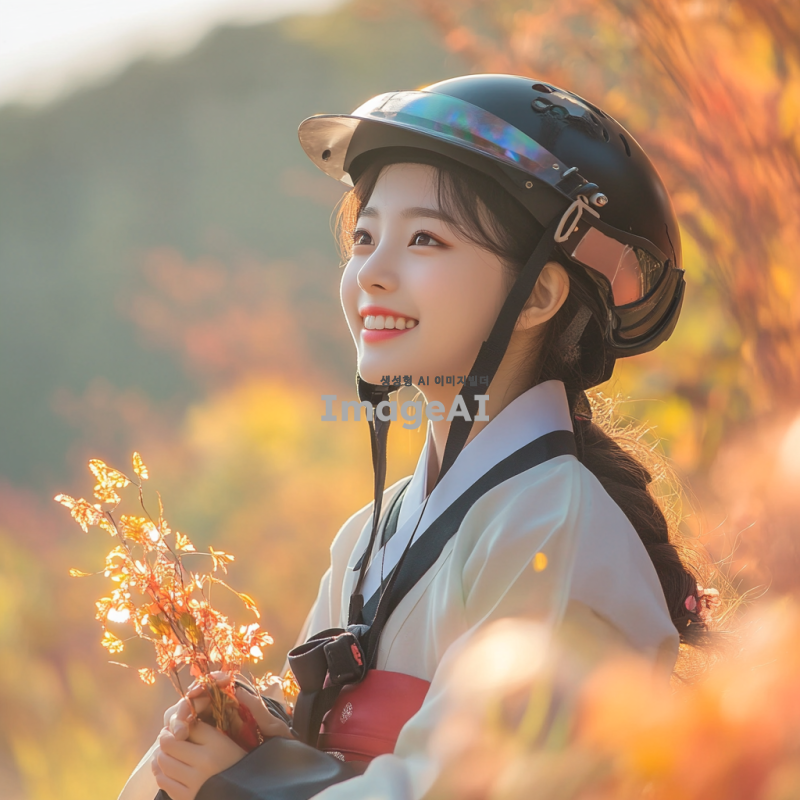 안전모를 쓰고 태극기를 들고 있는 한국 소녀, 밝은 미소를 지으며 주변의 자연 풍경 속에 서 있는 모습, 햇살이 비추는 따뜻한 분위기, 한국 전통의 아름다움이 느껴지는 배경, 소녀의 의상은 현대적이면서도 전통적인 요소가 가미된 스타일, 생동감 있는 색감과 조화로운 구도.