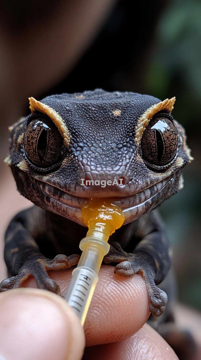 "A close-up of a small dark-colored crested gecko with large eyes and a slightly curled tail, sitting on a person's hand. The gecko is being fed from a syringe containing a golden-colored liquid, and it is licking the tip of the syringe. The background is slightly blurred, with a person's arm visible. The lighting is soft and natural, giving a warm and intimate feel to the scene."