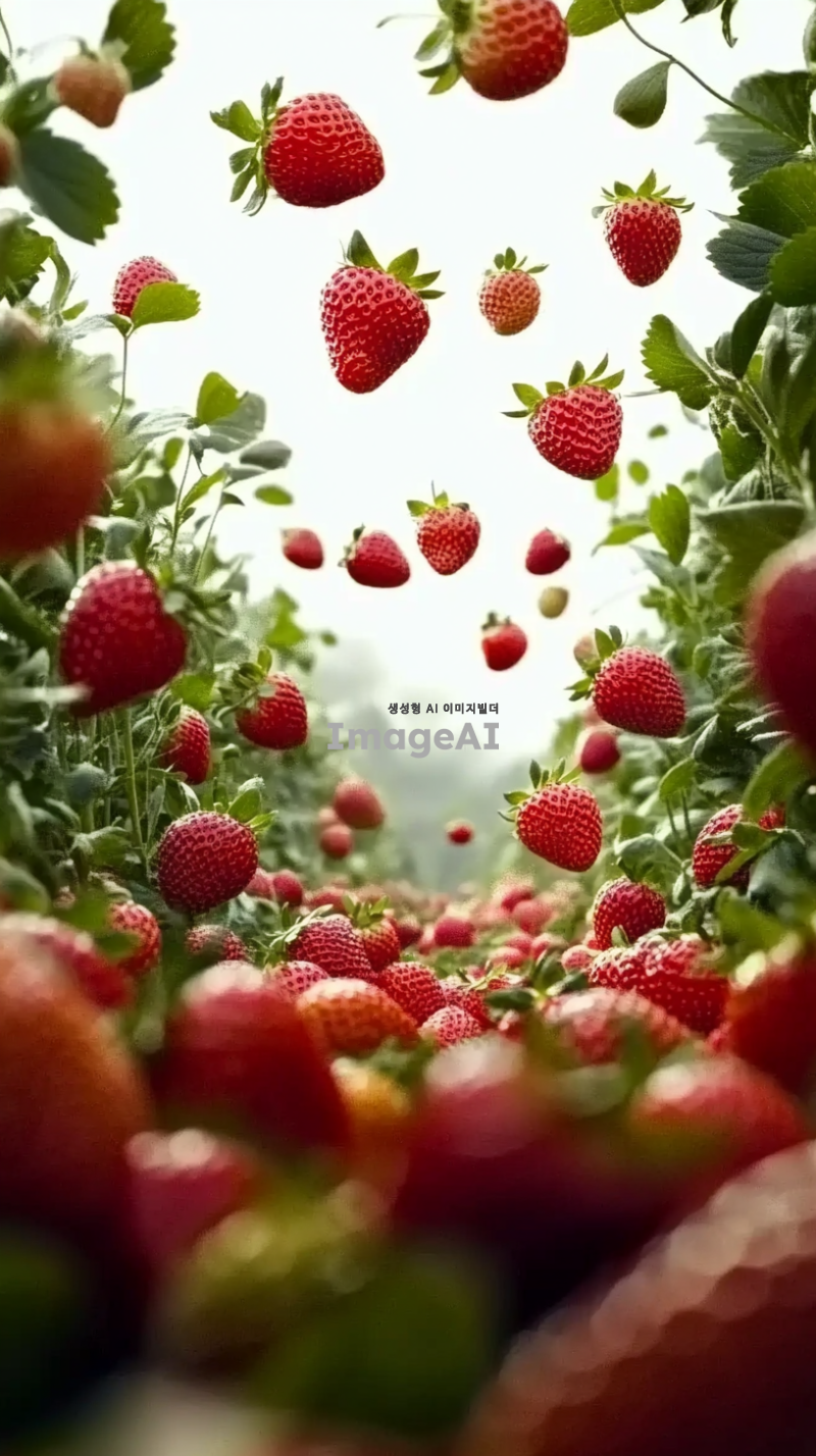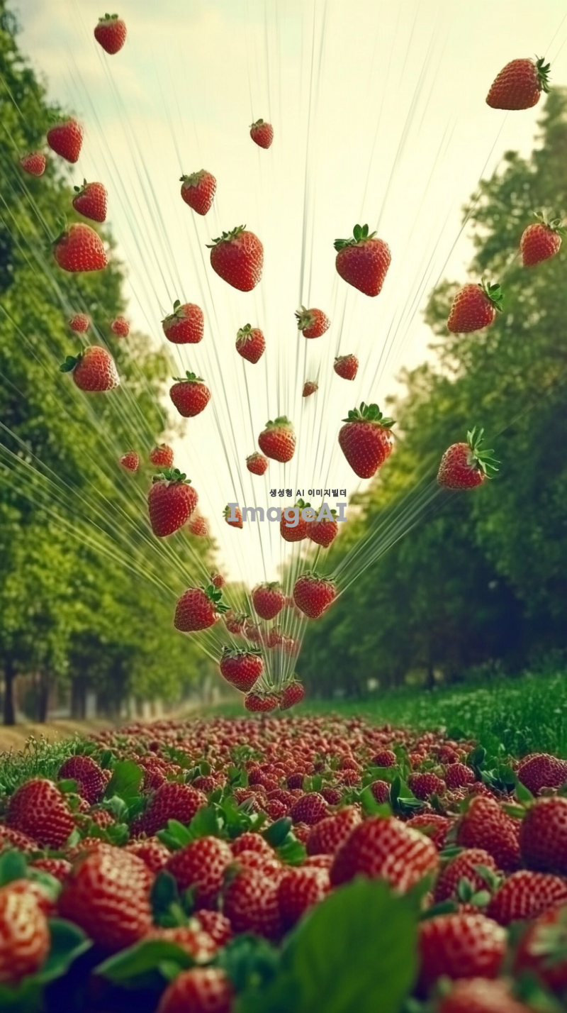 화려한 배경 위에 하늘에서 쏟아지는 신선한 딸기들, 다양한 색상의 꽃들과 푸른 나무들이 어우러진 풍경, 햇살이 비추는 따뜻한 분위기, 생동감 넘치는 자연의 아름다움, 상상력을 자극하는 환상적인 장면.