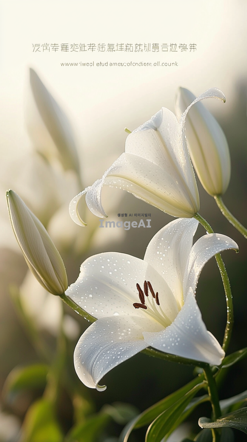 청순한 백합꽃이 부드럽게 피어오르는 장면, 햇살에 반사되는 물방울과 함께 꽃잎이 하나씩 열리는 모습, 배경은 흐릿한 자연 풍경, 따뜻한 색감의 조화, 평화롭고 serene한 분위기, 섬세한 디테일이 강조된 이미지.