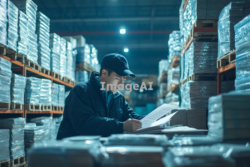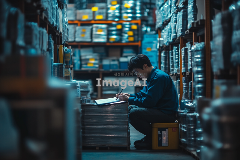 비철금속 산업 시장의 복잡한 거래 환경을 강조하는 이미지, 다양한 비철금속 제품들이 쌓여 있는 창고의 모습, 창고 내부는 어두운 조명으로 분위기를 아늑하게 하고, 한쪽에는 비철금속 주문서를 작성하는 한국인 직장인의 뒷모습, 그의 표정은 고민에 차 있으며, 주변에는 비철금속 관련 서적과 자료들이 흩어져 있는 모습, 산업의 어려움을 상징적으로 나타내는 배경 요소 추가.