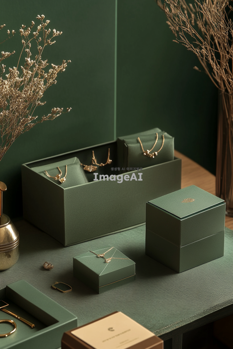 따뜻한 초록색 배경 위에 아름답게 디자인된 악세사리 포장 패키지, 자연적인 요소가 어우러진 모습, 부드러운 조명 아래에서 반짝이는 악세사리, 친환경적인 느낌을 주는 재료와 패턴, 세련되고 현대적인 스타일, 한국의 전통적인 디자인 요소가 섞인 패키지 디자인, 전체적으로 따뜻하고 아늑한 분위기.