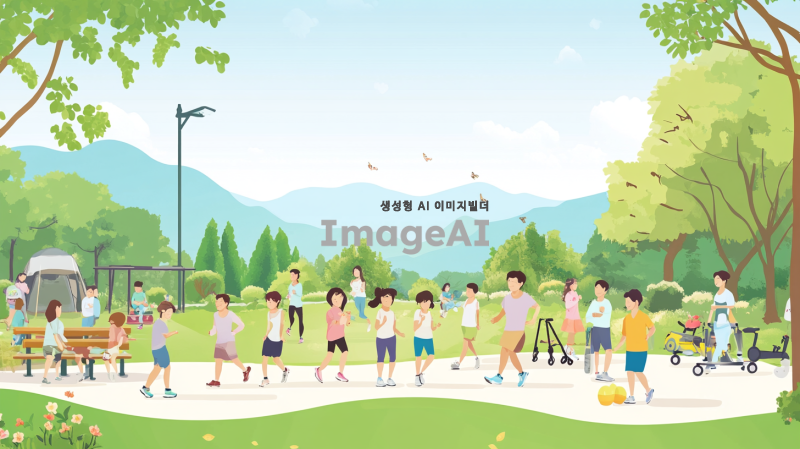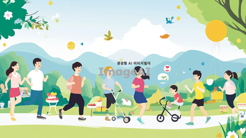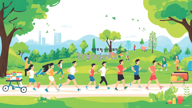 존2러닝과 건강의 관계를 주제로 한 PPT 표지 사진. 배경은 자연 풍경으로, 푸른 숲과 맑은 하늘이 어우러진 장면. 중앙에는 다양한 연령대의 한국인들이 조깅하거나 걷고 있는 모습. 사람들은 건강한 미소를 지으며 활동적인 자세를 취하고 있으며, 주변에는 운동 기구와 건강한 식품들이 배치되어 있음. 전체적인 분위기는 활기차고 긍정적이며, 건강과 운동의 중요성을 강조하는 느낌.