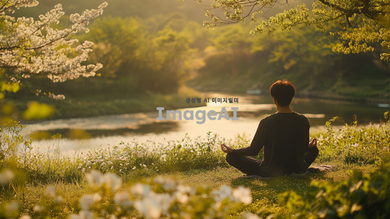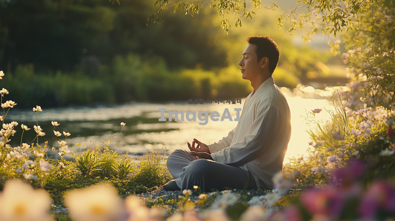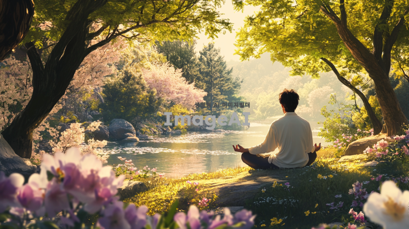 자연 속에서 평화롭게 명상하는 한국인 남성이 따뜻한 햇살 아래에서 나무와 꽃들 사이에 앉아 있는 모습. 주위에는 다양한 식물과 꽃들이 만개해 있어 생명력이 넘치며, 배경에는 부드러운 흐름의 강물이 지나가고 있다. 남성의 표정은 편안하고 평화로우며, 건강한 삶을 상징하는 요소들이 강조되어 있다. 전체적인 분위기는 치유와 안정감을 주는 따뜻한 색조로 표현된다.
