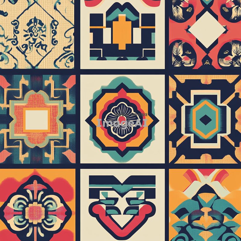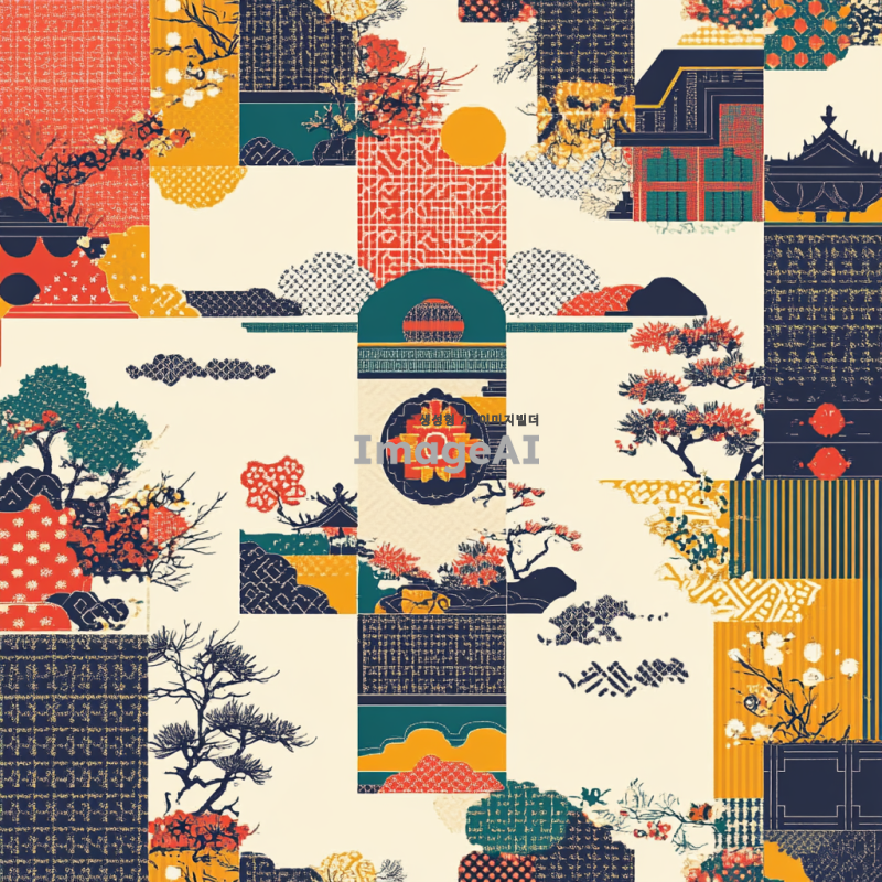 전통 한국 문양 패턴을 배경으로 한 디자인, 화려한 색상과 세밀한 디테일이 돋보이는 패턴, 고유의 한국적인 요소가 담긴 기하학적 형태, 자연에서 영감을 받은 모티프와 조화로운 구성, 전통과 현대가 어우러진 느낌의 아름다운 패턴.