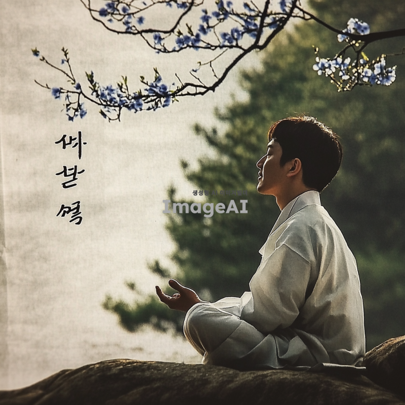 조용한 자연 속에서 편안하게 앉아 있는 한국인 남성이 명상하는 모습, 부드러운 빛이 그를 감싸고 있으며, 주변에는 푸른 숲과 흐르는 물소리가 들리는 평화로운 풍경, 마음을 진정시키는 따뜻한 색조의 조명, 고요한 분위기, 명상 음악과 어우러지는 serene한 느낌.